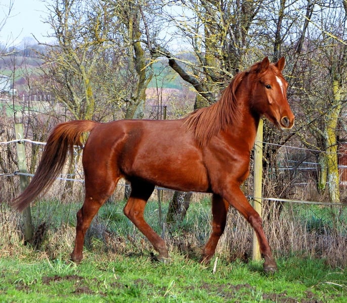 Kelta wurde 4 jährig eingeritten, da lernte sie unter anderem kleine Sprünge zu nehmen und sie war auch schon einige male im Gelände. Da sie über ein korrektes Fundament verfügt und tolle raumergreifende Gänge hat, wollten wir ein Fohlen aus ihr ziehen. Leider klappte dies nicht, weshalb wir sie jetzt doch schweren Herzens abgegeben. Sie hat einen sehr lieben Charakter, ist anständig im Umgang, schmust gerne, ist super verträglich in der Herde und dort eher rangniedrig. Kelta steht in 67440 Reutenbourg im Elsaß.