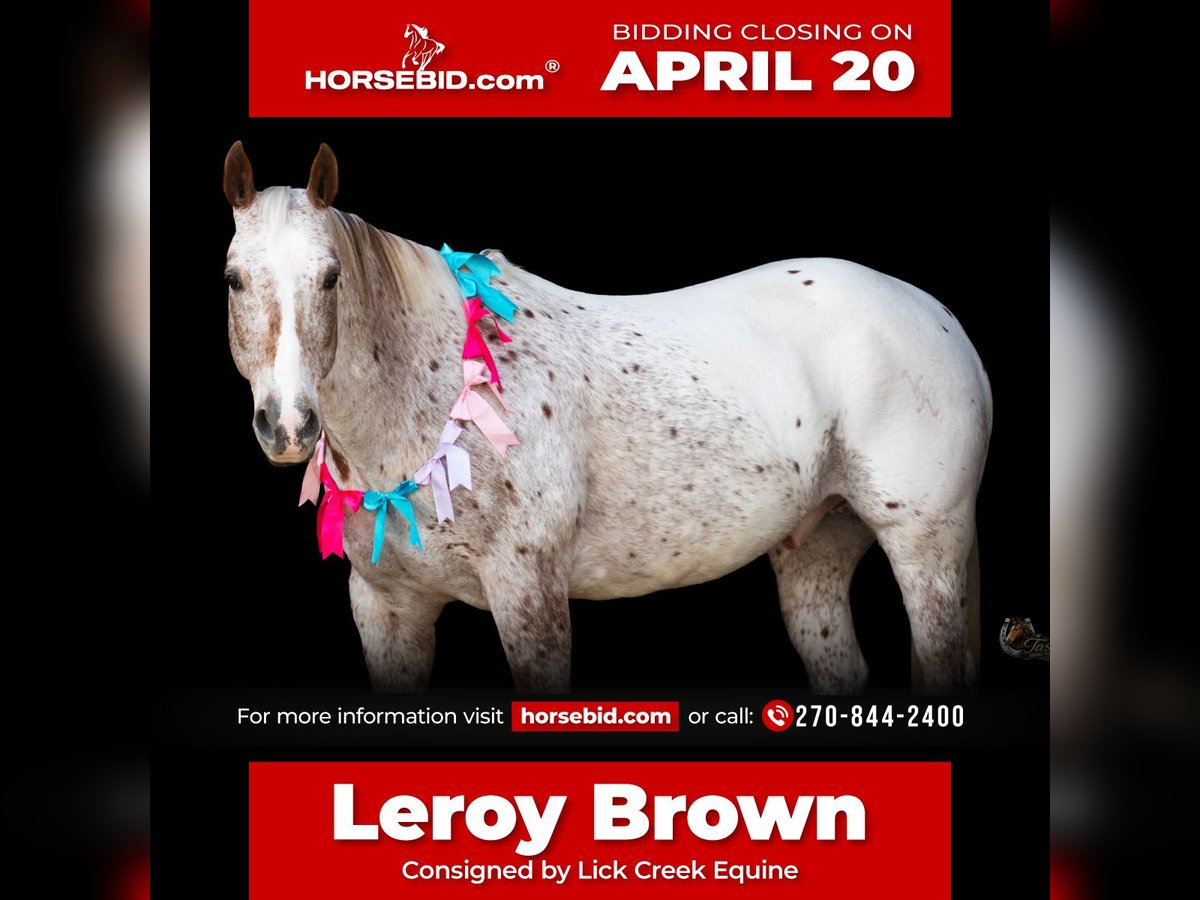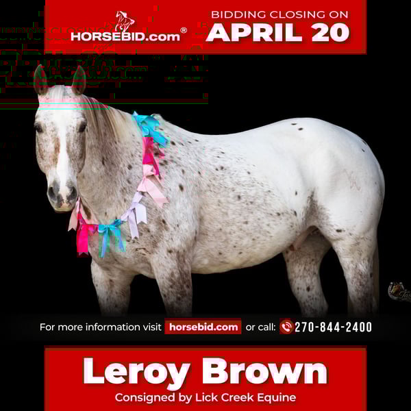 ⚜️𝐭𝐡𝐞 𝓔𝓵𝓲𝓽𝓮 𝐒𝐩𝐫𝐢𝐧𝐠 𝐂𝐥𝐚𝐬𝐬𝐢𝐜⚜️ Happening now thru MONDAY | APRIL 20th - Available EXCLUSIVELY on HorseBid's website! For more details and to register visit: www.Horsebid.com CONSIGNOR CONTACT: Lick Creek Equine 270-844-2400 LOCATION: Henderson, KY BREED: Appaloosa REGISTERED: No REGISTERED NAME: Leroy Brown COLOR: Appaloosa HEIGHT: 15 AGE: 10 GENDER: Gelding Want something that stands out in the crowd and everywhere you go. Look no further then Leroy Brown. He is a 10yr old Appaloosa gelding he’s selling grade but goes back to Duel Ray and Peppy San Badger on top side. He stands 15 hands tall and has all the color appeal you could want. He’s by far an eye catcher wherever he goes he gets noticed. If you’ve ever wanted that once in a lifetime horse Leroy is the one. There’s no job too big or too small for him. He’s one to want to please his owner. Leroy has been previously used as a pick up horse at rodeos, roped cattle in the pasture and worked at the stockyards. Since I’ve owned him we have went on several trail rides, through obstacles, Dairy Queen drive-thru, Chick-fil-a drive-thru and downtown. He does not get excited and loves all the attention he can get. Leroy is the trusty partner to get you through anything you ask him and be honest, sure-footed and safe. He will do all the obstacles, swim through water, cross creeks, bridges, logs, up and down steep hills. Leroy has a true one hand neck rein, he’s very soft in the face, will side pass to open and close gates, stops when asked and takes both his leads with ease. Leroy doesn’t care if you ride him with a bridle, halter, neck rope or grass string he always carries his head level and just walks right along. Leroy is currently shod all the way around. He stands great for the farrier, baths, tacking/untacking, and mounting. He does great in a stall as well and has great stall manners. He will load and unload himself in and out of the trailer with ease. If you would like to schedule a time to come meet and ride Leroy, or have any other questions about Leroy feel free to reach out at 270-844-2400. We are located in Henderson KY and can assist with transportation arrangements.