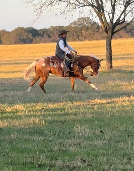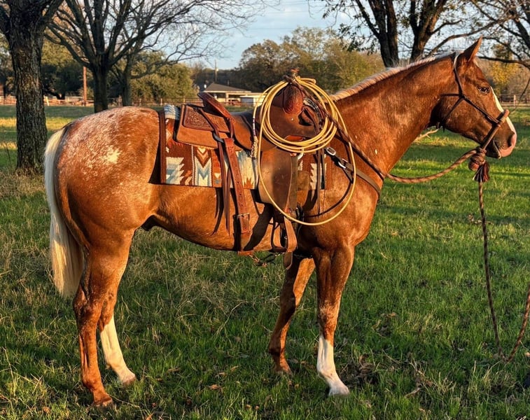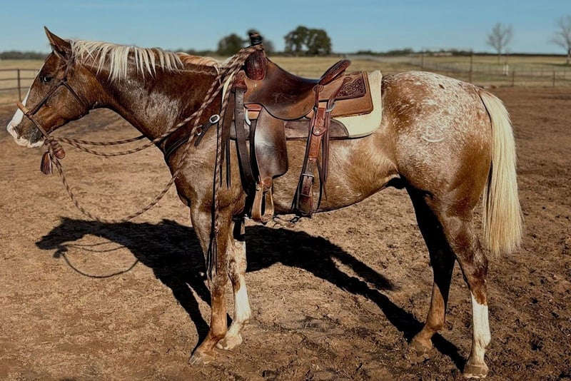 ♦️𝐍𝐄𝐖 𝐘𝐄𝐀𝐑'𝐒 𝑬𝒙𝒕𝒓𝒂𝒗𝒂𝒈𝒂𝒏𝒛𝒂♦️ Happening now thru MONDAY | JANUARY 12th - Available EXCLUSIVELY on HorseBid's website! For more details and to register visit: www.Horsebid.com CONSIGNOR CONTACT: Ellen Dayle Performance Horses 913-638-6771 LOCATION: Argyle TX BREED: Appaloosa REGISTERED: No COLOR: Flaxen chestnut HEIGHT: 15.1 AGE: 10 GENDER: Gelding Woodrow 10 yo ranch gelding standing 15.1 hh. Most of Woodrow’s life has been on the ranch and down the trail, but he has also given lessons to novice adult riders learning the basics of horsemanship. Saddle and go; he is comfortable to ride and has a big sweeping stride. Walk, trot, extended trot, and lopes both leads! Woodrow is ground covering and smooth. A solid horse with allot of bone. Solid feet, and large frame. Woodrow is an easy keeper whether in a stall or turned out in the pasture. Good in a herd; he can be turned out with mares, geldings, colts, and aged horses. Suitable for novice and intermediate lessons; open ranch horse shows, and an excellent trail companion. He is as big as he is beautiful in your pocket and a big ham bone ; Woodrow will do just about anything for a cookie! Woodrow is a great first horse for any teen looking for adventure and sturdy enough to pack a large rider on long trail rides. Rides in a variety of bits as well as a hack. UTD on vet & farrier. Recently tuned up by a professional trainer. Good minded and easy to be around no vices quirks or buck. A true gelding he loves people and has a willingness to please.