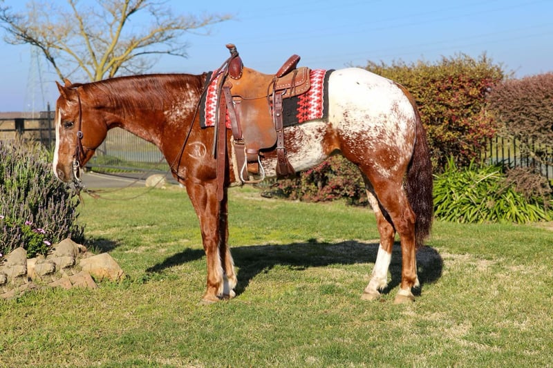 ONLINE AUCTION Place your bids at www.PlatinumEquineAuction.com Starting Bid $3500 Auction ends February 16th, 2025 Need a new saddle? Check out White Rock Saddles on our website or Facebook! If you’re looking for a horse that turns heads wherever he goes, AppleJax is your guy! Applejax is a beautiful 15.2H, 10 year old, Appaloosa gelding. This stunning gelding is the definition of fancy, with flawless movements and an impressive potential into show background. He was started in a reining program and has all the maneuvers you could ask for— a big, effortless slide stop, smooth spins, flying lead changes, and a low, collected headset. He moves with elegance and precision, making him an outstanding prospect for someone wanting to take him into the show pen. Beyond the arena, AppleJax is also an excellent trail partner. He’s confident and surefooted, handling rough terrain with ease. He crosses water, logs, and uneven ground without hesitation. He’s been exposed to cars, semis, livestock, wildlife, dogs, and quads, and he takes everything in stride, never overreacting. Whether you want to compete or just enjoy a stylish ride out on the trails, AppleJax is ready to go in any direction. This boy is a pleasure to have in the barn. He stands quietly for grooming, tying, saddling, and the farrier. He loads into the trailer with ease and is always eager to go on new adventures. AppleJax has been handled with care and is well-mannered, making him a joy to be around both in and out of the saddle. Due to his advanced training AppleJax isn’t recommended to be in a beginner home. He has all the buttons and responsiveness that make him an incredible athlete, but he needs a rider who can appreciate and utilize his talents to their fullest potential. If you’re searching for a high-quality, well-trained horse that is as fancy as they come, AppleJax is the one for you. He’s got the looks, the talent, and the versatility to excel in whatever you ask of him. Don’t miss your chance to own this exceptional horse! Located in Pleasant Grove, CA. Please contact Kamryn at KW Ranch 530-852-2032! ONLINE AUCTION Place your bids at www.PlatinumEquineAuction.com Starting Bid $3500 Auction ends February 16th, 2025 Need a new saddle? Check out White Rock Saddles on our website or Facebook!