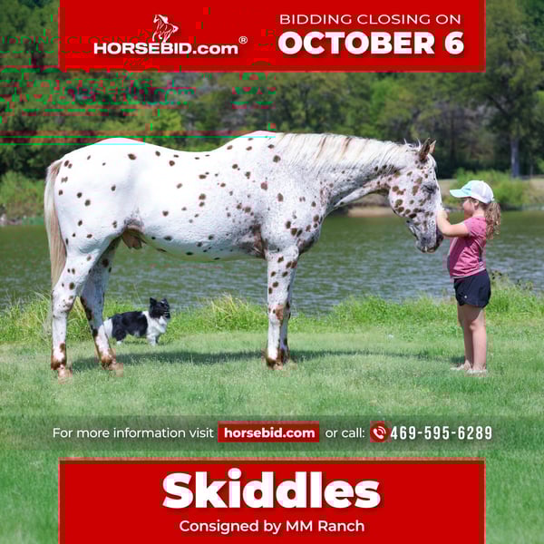 🍂 𝓐𝓾𝓽𝓾𝓶𝓷 𝑨𝑳𝑳 𝑺𝑻𝑨𝑹 𝑳𝑰𝑵𝑬𝑼𝑷 🍂 Happening now thru MONDAY | OCTOBER 6th - Available EXCLUSIVELY on HorseBid's website! For more details and to register visit: www.Horsebid.com CONSIGNOR CONTACT: MM Ranch 469-595-6289 LOCATION: Forney TX BREED: Appaloosa REGISTERED: No COLOR: Leopard Appaloosa HEIGHT: 15 AGE: 12 GENDER: Gelding If you are looking for a safe, reliable, and truly versatile gelding, look no further — Skiddles is the one. This drop dead gorgeous leopard Appaloosa gelding is the definition of bombproof. 💣 Skiddles is just 12 years old. Stands 15 hands tall. Gentle, quiet, and dependable in EVERY WAY, he is the type of horse that is hard to come by and even harder to let go of. Skiddles has been ridden both English and Western, making him suitable for a wide variety of riders and disciplines. Whether you want to enjoy a relaxing trail ride, riding on the ranch and checking cattle, riding in the arena, or even dabble in English work, he has the mindset to adapt to whatever you ask of him. He has also been roped on outside the arena, and handles the job with ease and willingness. 💥💥 He is the same horse every time you saddle him. Skiddles rides off quietly, neck reins, and stays soft in the bridle. He will walk, trot, and lope on a loose rein, and steps up willingly when asked without ever being hot or hard to handle. Out on the trails, he is steady and sure-footed. He crosses water, handles rough terrain, and doesn’t spook at the unexpected. Whether you ride alone or in a group, Skiddles stays calm, making him an ideal choice for anyone who values safety and confidence in their horse. 👉🏼👉🏼 Skiddles has the kind of mind and disposition that makes him suitable for any rider. He is kind and forgiving for someone learning, yet broke and responsive enough for an experienced hand to enjoy. His versatility, striking color, and absolute gentleness make him a standout gelding you can trust in any situation. ⚡️⚡️ Horses like Skiddles don’t come along often and we are proud to offer him! He is 100% safe and sound in every way!!!! We can help arrange shipping if needed.