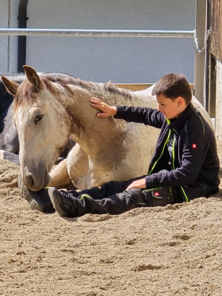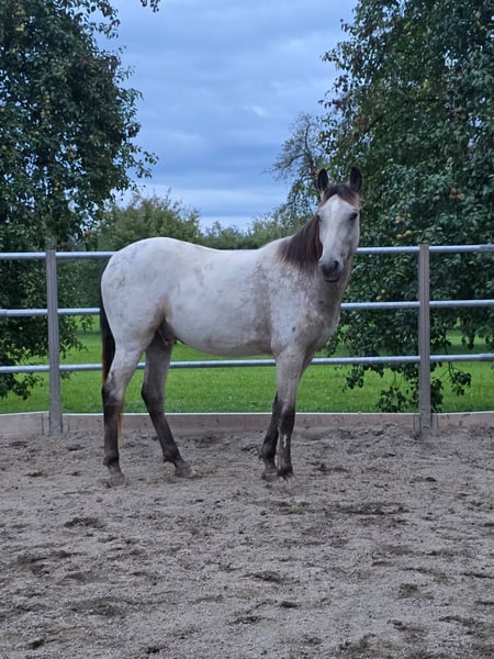 Lewis of Steepy Hillock is an Appaloosa in a special Buckskin coat, with a thick mane and tail, and excellent conformation. His current owner has familiarized him with everyday situations; he naturally knows the foal ABCs, is accustomed to all land and construction machinery, and is well-behaved when being groomed, tacked up, and having his hooves picked out. His greatest asset is his friendliness towards children! Additionally, he has already been lunged with a saddle pad and girth and has experienced walks through the village (even alone). Lewis is very well-behaved for his age, full of potential, and at the perfect age for further training. Of course, he can also be a bit of a rascal — which gelding isn’t at that age?! Lewis descends from our wonderful broodmare Topas, who has passed on her sweet temperament to all her foals: friendly, human-oriented, affectionate, well-mannered, with a pleasant temperament and excellent trainability. An older full brother of Lewis has already been ridden and has also become a fantastic family horse. He was sold as a weanling and spent about a year on a large foal pasture before moving to the private open stable of his current owner. Unfortunately, and with a heavy heart, she has to part with him due to health reasons. As breeders of Lewis, we support her in finding new loving homes for him — in this case, we are acting as Vermittler (intermediary), not sellers. For Lewis, we are looking for a final home with a family environment and owners who appreciate what they are getting with this wonderful, healthy young horse. His age and his very conscientious upbringing during the foal and young horse phases are important advantages for this handsome guy in an Appaloosa coat. Are you looking for a solid, good-looking, and characteristically sound young horse? Your search ends here! Please contact us to arrange a viewing appointment. The horse is located in Eastern Switzerland. Further information about our Appaloosa breeding and Lewis’s dam can be found on our website felihof.ch. We breed Foundation Appaloosas — so Lewis is a true Native American horse! Please note that the price is a starting point with some room for negotiation. Lewis comes from responsible breeding and is a purebred Appaloosa. His price reflects his quality accordingly.
