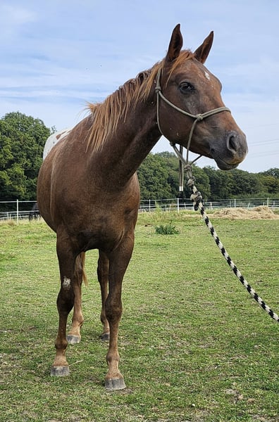 Waps Rolex ApHC Appaloosa 2021 hongre alezan suédé avec blanket et points 156 m au garrot (en cours de croissance) Sire : Waps Rolls Royce (160cm) Dam : Shez A Rolex Machine (158cm) multiple Res. and World Champion ApHC ▪︎ 5 panel N/N 30 jours sous la selle directement de l'éleveur Débourré en forêt, marche devant ou derrière dans le groupe pas, trot, galop, arrêt et marche arrière Fait vraiment plaisir à monter !! sabot nu, très bonne qualité de sabot Passeport équin, vacciné, vermifugé régulièrement, contrôle dentaire et soins des sabots. Localisation au Luxembourg