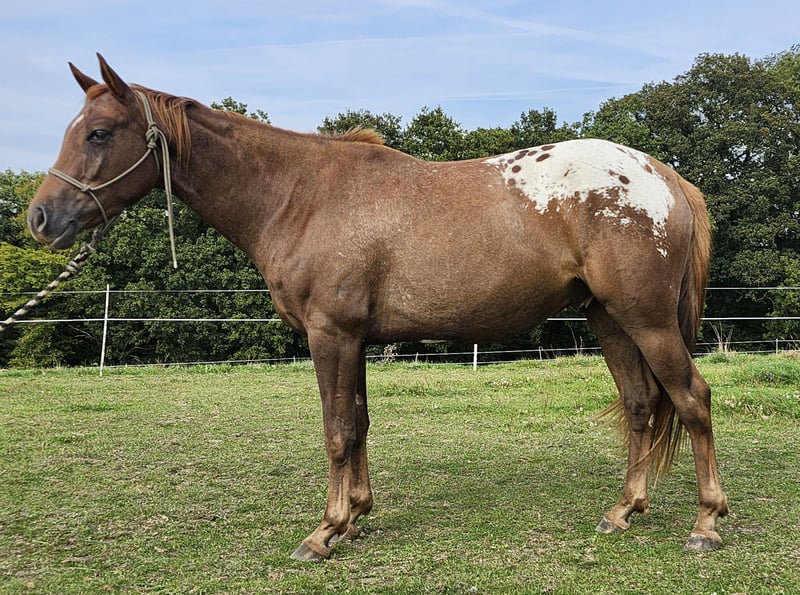 Waps Rolex ApHC Appaloosa 2021 sweat chestnut gelding with blanket and points 156 stick mass (still growing) Sire: Waps Rolls Royce (160cm) Dam: Shez A Rolex Machine (158cm) multiple Res. and World Champion ApHC ▪︎ 5 panel N/N 30 days under saddle directly from the breeder Ridden out in the forest, goes in front or behind in the group Walk, trot, canter, stop and backwards A real pleasure to ride!!! barehoof, very good hoof quality Equine passport, vaccinated, regularly wormed, dental check and hoof care. Location in Luxembourg Tel: +352-621-328144 We speak German, French and English