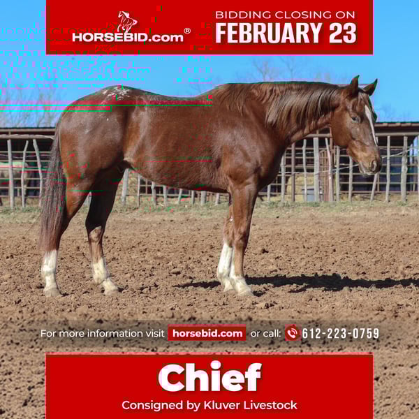 💎 𝐓𝐇𝐄 𝓓𝓲𝓪𝓶𝓸𝓷𝓭 𝐒𝐇𝐎𝐖𝐂𝐀𝐒𝐄 💎 Happening now thru MONDAY | FEBRUARY 23rd - Available EXCLUSIVELY on HorseBid's website! For more details and to register visit: www.Horsebid.com CONSIGNOR CONTACT: Kluver Livestock 612-223-0759 LOCATION: Ripley, OK BREED: Appaloosa REGISTERED: No REGISTERED NAME: Chief COLOR: Appaloosa HEIGHT: 15 AGE: 5 GENDER: Gelding Brining to you, Chief a 5 year old grade appaloosa gelding standing at 15 hands tall and weighing 1000 pounds. He’s got a cute spotted blanket and a thick nice tail! Chief is a horse with a great personality to his people and other horses. He wants you to love on him all day long and be his best friend. He is an easy keeper and can be turned out by himself or with a herd with no issues. He walks up to you at the gate and is easy to catch. Chief is a solid and gentle gelding with no buck or rear. He is a been there done that gelding with a quiet mind! He has been used at the feed lot, sale barns, rode english, trail rode more hours than we can count, sort cows, and rode through town and water. He is extremely gentle and enjoyable to ride. Take him as your right hand man for your weekend long trail rides and adventures. He dosnt bat an eye at anything he’s one you don’t have to worry about no matter what environment your in! He is an extremely well seasoned trail horse! He is one sure footed horse and will cross anything and not miss a beat!