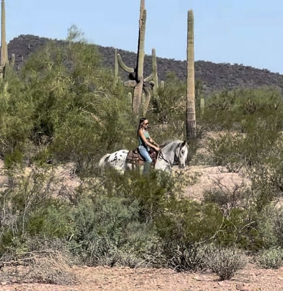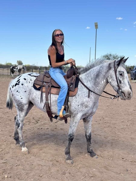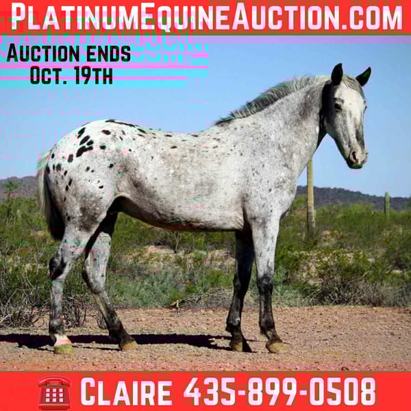 ONLINE AUCTION Place your bids at www.PlatinumEquineAuction.com Starting Bid $3500 Auction ends October 19th, 2025 Need a new saddle? Check out White Rock Saddles on our website or Facebook Popeye is ready to be your new best friend! This 8 year old Appaloosa gelding is friendly, kind and is always the first one to greet you at the gate. Popeye stands 14.2 with good bone and shape to him. While he lacks in a tail department, he makes up for it with his big heart and willingness to please! He is gentle and easy to get along with, without being a lazy boy. Popeye has a ground covering walk out on the trails and loves to go out for adventures. He’s not spooky and will cross anything you ask him to. He is comfortable around dogs, traffic, tractors, and loud noises and gets along well with other horses. He has been hauled around a few times to events for exposure and handles new environments with ease. Popeye has a nice handle in the arena and rides one handed or two, and has a good stop and turn around and back up. We have played around with him on the barrels a couple times now and he seems to really enjoy that as well! He would make a great horse for playdays or even be a great rope horse prospect. Popeye has wonderful ground manners, he stands tied, bathes, loads and hauls. He is well behaved for the farrier and is currently shod on all four. He is sound with no maintenance. Popeye wants to be someone’s best buddy, make him your number one and I’m sure he’ll move mountains for you! Located in Marana Arizona, and we are happy to help arrange shipping anywhere! Popeye will come with a current coggins and health certificate. Please feel free to call/text Claire Siebols anytime with questions about Popeye at 435-899-0508. ONLINE AUCTION Place your bids at www.PlatinumEquineAuction.com Starting Bid $3500 Auction ends October 19th, 2025 Need a new saddle? Check out White Rock Saddles on our website or Facebook