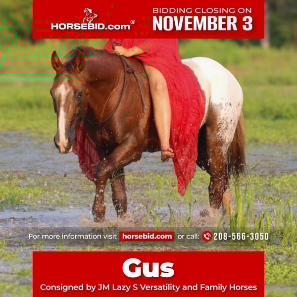 ⚜️𝐓𝐇𝐄 𝐅𝐀𝐋𝐋 𝐇𝐄𝐑𝐈𝐓𝐀𝐆𝐄 𝐂𝐋𝐀𝐒𝐒𝐈𝐂⚜️ Happening now thru MONDAY | NOVEMBER 3rd - Available EXCLUSIVELY on HorseBid's website! For more details and to register visit: www.Horsebid.com CONSIGNOR CONTACT: JM Lazy S Versatility and Family Horses 208-566-3050 LOCATION: Baxter Springs, KS BREED: Appaloosa REGISTERED: Yes REGISTERED NAME: JMS Leavin Lonesome Dove COLOR: Chestnut Blanket HEIGHT: 15.2 AGE: 8 GENDER: Gelding JMS Leavin Lonesome Dove, better known as Gus, is the kind of horse that makes you feel like a real cowboy. Not to mention, he’s a movie star himself, featured in the new western film The Dead Don’t Hurt. Gus is an 8-year-old ApHC colored registered gelding standing a perfect 15.2 hands. He’s got a big, beautiful hip, a kind eye, and keen ears that make him handsome even if he were a plain sorrel. He’s as gentle and broke as they come, with more real-life, ranch, and trail experience than most horses three times his age. Gus has been the go-to mount for novice guests, tricky ranch chores, and relaxing trail rides alike. He’s been used to doctor cattle, gather pastures, and brand calves, and he worked weekly at the local sale barn penning back cattle and calves. He’s even been known to drag the occasional resistant bull or wild cow back to their pen. As handy as Gus is in his working clothes, he’s just as impressive out on the town. He rides bareback and bridleless, lopes slow and collected circles on either lead, and has shown successfully in ranch pleasure, trail, and western riding. He’s also dabbled in cross-country style jumping and would make a super fun foxhunting or versatility mount. We had the pleasure of selling Gus at Fall Roundup Horse Sale last year. He spent the year giving lessons and being adored by some little girls. When a move across the country forced his sale, we were thrilled to welcome him back. Last year, he was the first place winner out of 65 head in the trail course — which he completed completely bridleless. He also lays down and bows, adding a little extra flash to an already impressive résumé. Gus would be exceptional candidate for working equitation, competitive trail or extreme cowboy competitions. With his quiet demeanor and go with the flow attitude you won't find much that phases him, not to mention he's extremely easy to ride and is very user friendly. Whether you want to rope calves, doctor cattle, hit the trails, or ride English, Gus can do it all. He is absolutely safe, absolutely gentle, and one of the most versatile, enjoyable geldings you’ll ever swing a leg over. Gus truly is the total package — beautiful, broke, kind, and ready to make someone’s next chapter a great one. He's up to date on dental, chiropractic, worming, farrier, and coggins. Give us a call or text Molly (208)566-3050 or John (208)310-5686 for more information about Gus.