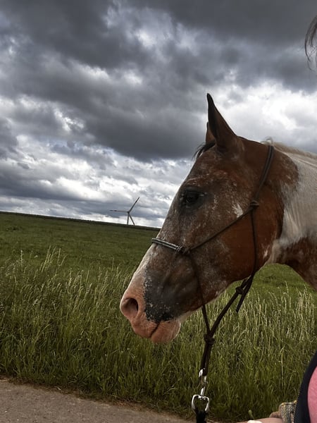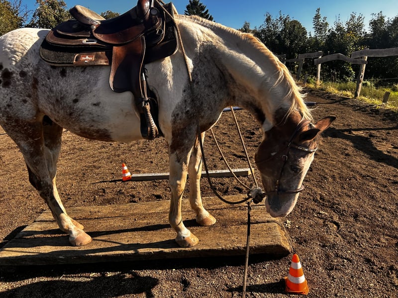 Zum Verkauf steht eine Appaloosa-Stute mit wunderschönem, auffälligem Fellmuster und viel Ausdruck. Sie wurde vorletztes Jahr im Juni im Alter von neun Jahren angeritten. Anschließend war sie drei Monate in professionellem Vollberitt und wurde danach von mir regelmäßig weiter gearbeitet und durch Reitstunden gefördert. Die Stute wurde western geritten und ist gebisslos mit Bosal ausgebildet, was ihr sehr gut liegt und ihr angenehmes, feines Reiten ermöglicht. Sie ist kein Anfängerpferd. Als sensible Stute braucht sie etwas Zeit, um Vertrauen zu ihrem Menschen aufzubauen. Gibt man ihr diese Zeit, zeigt sie sich sehr gelehrig, motiviert und arbeitsfreudig. Sie lernt schnell und hat große Freude daran, neue Aufgaben zu bekommen. Abwechslung und gemeinsame Arbeit wie z.B. Bodenarbeit machen ihr sichtbar Spaß, und mit zunehmender Sicherheit sind klare Fortschritte erkennbar. Im Gelände war sie bereits mehrfach mit mir unterwegs – sowohl in der Gruppe als auch alleine. Das hat bisher sehr gut funktioniert. In manchen Situationen kann sie etwas schreckhaft reagieren, was man einkalkulieren sollte. Diese Reaktionen sind jedoch gut händelbar und kein unkontrolliertes Verhalten, sondern eher Ausdruck ihrer Sensibilität. Eine tolle Stute für einen erfahrenen, ruhigen Reiter, der Freude daran hat, Vertrauen aufzubauen und gemeinsam mit seinem Pferd zu wachsen – kein fertiges Pferd, sondern ein Partner mit Potenzial. Bei mir wurde sie regelmäßig entwurmt und geimpft. Weitere Fragen beantworte ich gerne.