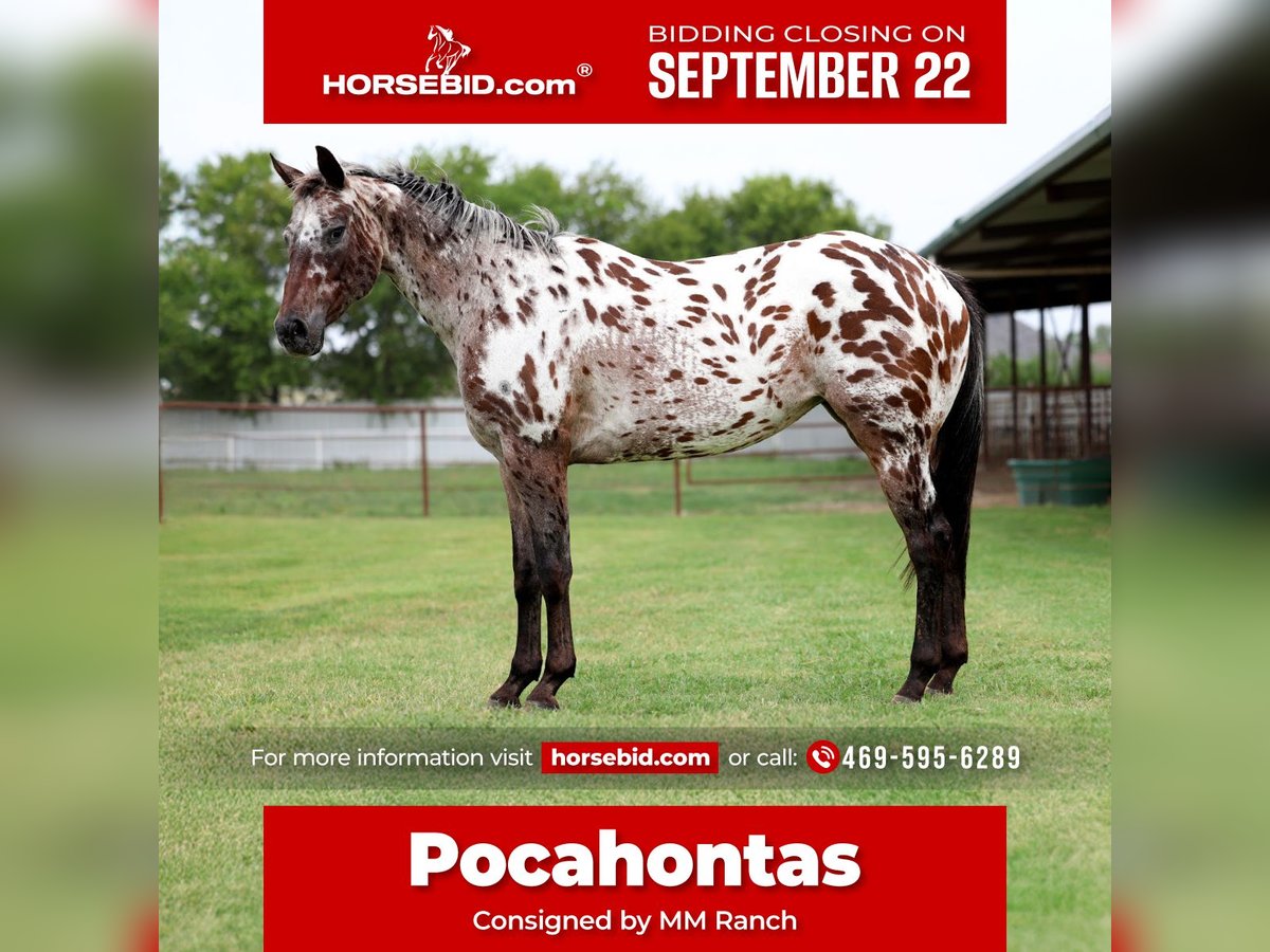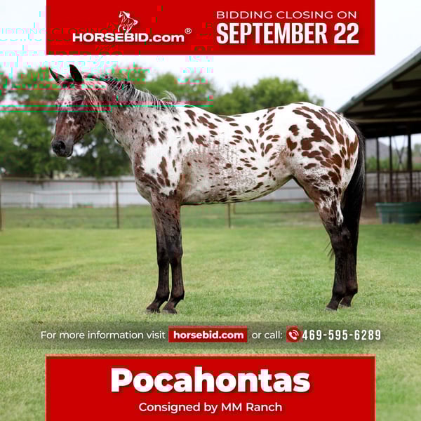 🍁𝒕𝒉𝒆 𝐅𝐀𝐋𝐋 𝑺𝒑𝒆𝒄𝒕𝒂𝒄𝒖𝒍𝒂𝒓🍁 Happening now thru MONDAY | SEPTEMBER 22nd - Available EXCLUSIVELY on HorseBid's website! For more details and to register visit: www.Horsebid.com CONSIGNOR CONTACT: MM Ranch 469-595-6289 LOCATION: Forney, TX BREED: Appaloosa REGISTERED: No COLOR: Appaloosa HEIGHT: 15 AGE: 15 GENDER: Mare Meet Pocahontas!! WOW!! Wow is best way I know to describe this girl. She is spotted for head to tail LITERALLY and technically even her toes. (Even in her black legs hairs there are spots.) She is the color you don’t see everyday. She is 14 yrs old and stands 15 hands tall. A true Appaloosa 😂 (i don’t know if she is roan leporad, bay blanketed, snowflaked, marble, all of the above, etc… all I know is she has a lot of spots.) If you want to stand out from the crowd Pocahontas is the way to go. 🐆 She is just as gentle and sweet as she is glamorous!! This mare is the true definition of gentle, safe, well-mannered, in your pocket, and is an absolute sweetheart!! Whether you’re looking for a horse for the whole family to hit the trails, a solid broke mount to go do a days work on, or a smooth ride to play around in the arena Pocahontas is your girl!!! She has been used around ranches her whole life, making her very experienced and versatile! She’s great if rode once a week, once a month or even once every 6 months! She doesn’t get fresh. No tune up required. She’s the kind you can just jump on and go! Pocahontas will go absolutely anywhere you point her, through rough rocky country, steep slippery slopes, thick brush, flowing waters, busy streets of town, you name it and she will go on through it without batting an eye and surefooted as can be! Cruise on down the trail with ease!! She is not only great to ride outside, she’s an absolute blast in the arena as well! She will walk, trot, and lope both ways with ease. Smoothly picks up both her leads, neck rein and has a good stop! Pocahontas would be a great fit whether you’re 5 years old or 85 years old, a beginner rider or an experienced rider. She has been used to gather and sort cattle, and used for roping both in and out of the arena. She has absolutely no buck or bad habits. 100% sound. Sound to bred as well if you want to go that route. 🌎 We can and will help arrange shipping for you.