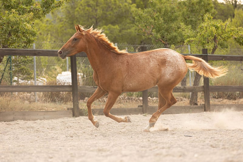 ✨ ARIZONA - Potra con alma de compañera y un corazón enorme ✨ Te presentamos a Arizona, una joven yegua nacida en marzo de 2023, cruce de Appaloosa con sangre KWPN y Española. Con pasaporte español y posibilidad de inscripción en el registro auxiliar de ANCADES (Caballo de Deporte Español). Arizona destaca por su carácter profundamente humano. Es extremadamente cariñosa, curiosa, cercana, y le encanta estar con las personas. Le gusta ser el centro de atención y disfruta de la interacción constante, siempre con esa energía positiva que conquista desde el primer momento. Está empezando a explorar el mundo de manera suave y respetuosa. Conoce los básicos: • Se deja cepillar y duchar sin problema • Da correctamente los cascos • Se comporta perfectamente con el podólogo equino (visita cada 6 semanas) • Está desparasitada y vacunada • Se ata con tranquilidad • Sabe dar cuerda y escucha los comandos a la voz. • Sale a pasear del ramal por el bosque Como todos nuestros caballos, Arizona ha sido criada en un entorno donde priorizamos el respeto, la confianza y el bienestar emocional. Nuestra doma comienza desde el suelo, creando un vínculo real entre caballo y persona. Alimentación natural y completa: • Heno a libre disposición 24h • Alfalfa • Cobs de hierbas de los Alpes • Mash • Mezcla de copos de cereales variados Su pelaje rojo tostado y sus crines rubias le dan una belleza muy especial, pero lo que realmente enamora es su forma de mirar, su cercanía, y sus ganas de compartir tiempo contigo. Arizona es perfecta para alguien que quiera comenzar una historia desde el principio: con calma, con amor, y con la ilusión de construir una relación sana y profunda. Si quieres conocerla mejor, contáctanos por teléfono o WhatsApp. Estaremos encantados de darte más información, fotos o vídeos