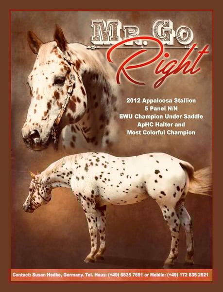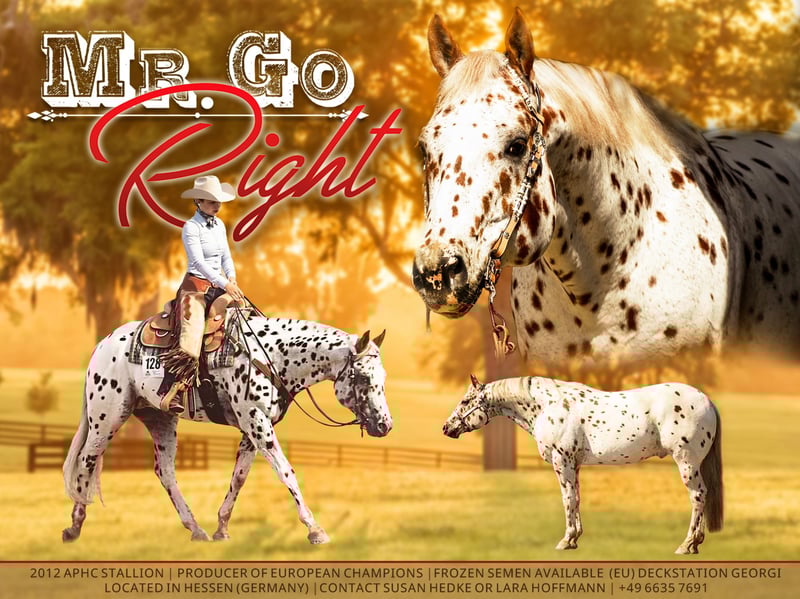 Mr Go Right (Rusty) is a registered Appaloosa stallion (ApHC and AphCG) and 5‑panel N/N. He comes from strong performance breeding with many colorful Appaloosas in his pedigree. He is sired by the leopard‑colored, money‑earning Reining and Cowhorse stallion Rusty Lil Dry Doc. Rusty’s pedigree includes numerous legendary performance stallions from Reining, Cutting, and Cowhorse lines—some of whom were also successful in Halter. This versatile mix of bloodlines makes him especially suitable for modern disciplines such as Ranch Riding. His Hall of Fame ancestors include: High Sign, High Sign Nugget, Dry Doc, Ima Doc Olena, Doc Olena, Doc Bar, Poco Bueno, Goer (twice), and Romans Straw Man. His pedigree also features other colorful and highly successful stallions such as Rustys Lil Nugget, a successful Halter Champion and multi‑discipline performer with a World Champion title in Cow Horse. Another leopard Appaloosa ancestor, Ima Dazzelena, earned recognition in Reining and reached the title of “Supreme Champion” in Germany. This outstanding breeding alone makes Mr Go Right a compelling choice as a performance sire. But what makes Rusty even more uniquely appealing is his striking appearance, excellent conformation, and impressive size (163 cm). He has the presence and quality to excel across multiple disciplines, even in Halter. His double “Goer” breeding on both sire and dam side, combined with the influence of Romans Straw Man—whose stud fee reached $10,000 in the 1980s—adds exceptional value to his pedigree. At his single show appearance in 2017, Rusty was named International Grand Champion, which immediately placed him in the Top 5 of the ApHC World Standings in both “Aged Halter Stallions” and “Most Colorful at Halter.” Three of his foals have been successfully shown in Halter up to European Championship level: – One earned a ROM in Halter by age 3. – Another became Grand Champion in a large EM class of “Geldings All Ages.” Mr Go Right is also an exceptional mover. At European Western Union (EWU) shows, he won and placed well in various performance disciplines—from Reining to Pleasure— and he earned gold and silver for two consecutive years in Dressage and Young Horse Trail at the state championships. Early in his career he showed notable talent for Ranch Riding. Because Rusty has not been shown in recent years, his high‑quality frozen semen remains available at an affordable price. Additional discounts may be offered for proven show mares or multiple mares (contact Susan Hedke or Lara Hoffmann). His frozen semen is available within the EU through Claus Georgi: 👉 https://www.westernstablegeorgi.de/besamungsstation/tg-samen-hengste 👉 https://www.westernstablegeorgi.de