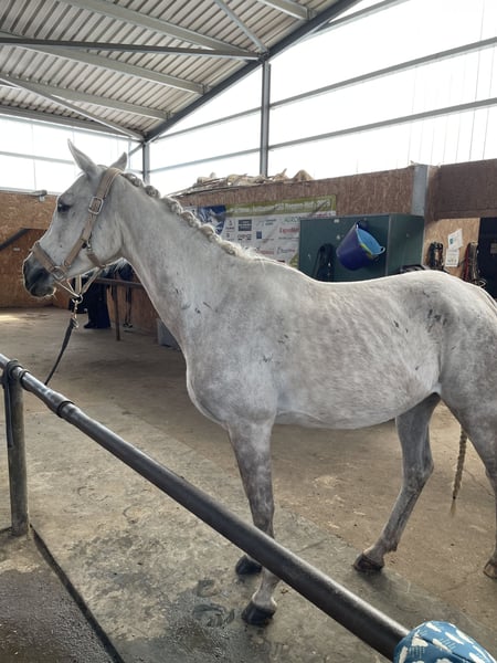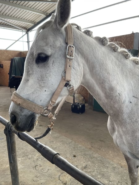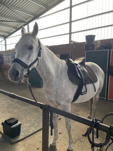This graceful Arabian Thoroughbred mare was born in 2015 and impresses with her striking appearance and confident personality. With her elegant gray coat and a height of 16.1 hh, she is a true eye-catcher in any setting.