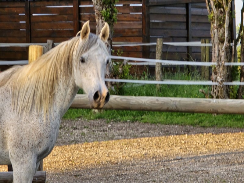 Purebred Arabian broodmare, grey with a tricolor coat, born in 2014. Show-quality origin, daughter of the champion SHANGHAI EA. Price: €6,000. Phone: 06.23.52.49.84