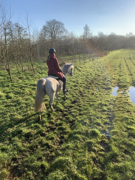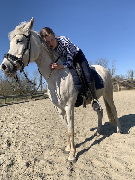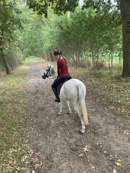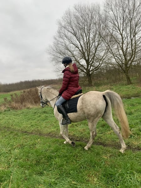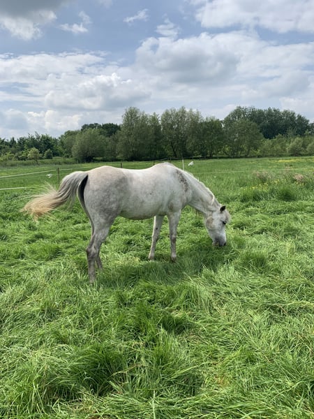 Onze dochter is haar met haar 1,80m helaas ontgroeid: 1,48m Arabier merrie, 12 jaar oud Volle arabische stamboekpapieren, bij de vorige eigenaar (fokker) veulentjes gehad Basis gereden in de piste Super wandelpaard, altijd braaf, kijkt naar niets Ook geschikt voor bvb een mama, die met haar dochter wil gaan wandelen: zij kan ook met een minder ervaren ruiter op stap en blijft altijd netjes bij de andere paarden Staat overdag in de kudde en s’nachts op stal, onderdanig Leert snel Ongelooflijk flink in de omgang Alles netjes gedaan: vaccinaties, tandarts, twee ijzers Gemakkelijk op verplaatsing Enkel voor een super thuis We houden graag contact
