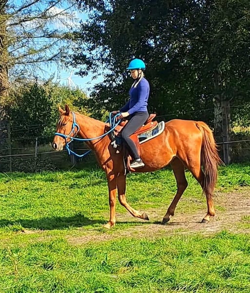For sale is a beautiful Thoroughbred-Arabian mix mare, born in 2022. With her elegant chestnut coat and a height of 156 cm, she is truly a sight to behold. This talented mare is exceptionally suited for endurance sports and already shows great potential. She is spirited yet manageable, with a friendly character that makes her an ideal partner for ambitious riders. The mare is well-socialized and has already gained initial experience in handling with other horses. She is healthy, vaccinated, and regularly dewormed. If you are looking for a promising endurance horse partner, this Thoroughbred-Arabian mare is just right for you! For inquiries or more information, please feel free to contact us.
