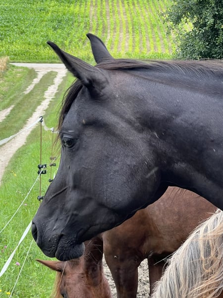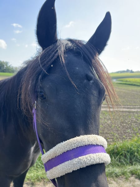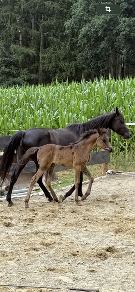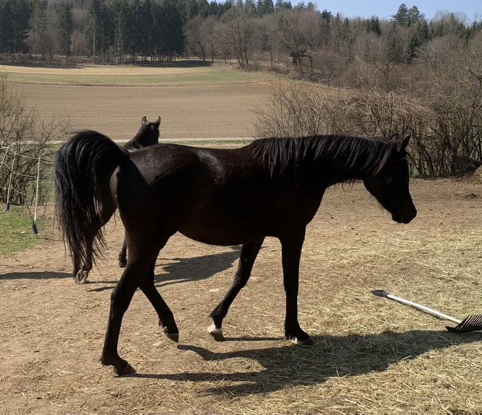 My beautiful Amy is looking for her heart person, someone who has time for her and can show her the world, for whom she can be a friend and partner. Amy is curious, clear-headed, always eager to participate, and wants to do things right. She has just had her first foal at her side, but she is not happy with that; she wants to be important to someone, someone who will explore nature with her and support her. She loads into the trailer without any problems, enjoys going for walks alone and away from the herd, and will soon be prepared for her riding career. Amy was born and raised with me. Her mother and brother are also with me. As a foal, she had an injury on her forehead, which has left a thickening as a scar. This could be surgically removed, but since it would only be a cosmetic procedure, we chose not to do it; it doesn’t bother her, she is our little unicorn. Not everyone has that. She is low in the herd hierarchy, so she should not be in too large groups. She lives 24/7 in a loose housing system with a hay feeder. A place in a loose housing system, movement, and horse companionship are prerequisites. We look forward to friendly inquiries with a brief info about your space, plans, etc. You are welcome to come and take a look and get to know her. If you have any questions, feel free to contact me at 01729919663