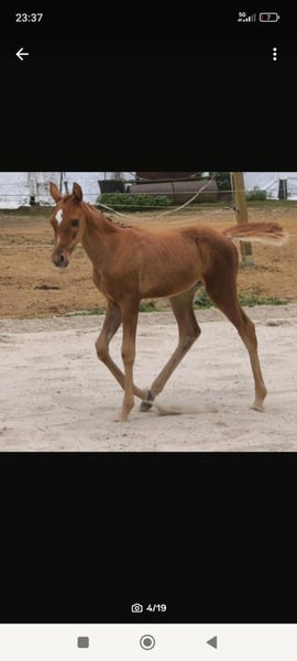 A stunning filly with a Two-Star Foal Premium is for sale. We are pleased to offer a beautiful purebred Arabian filly born this year, with full papers from ZSAA. This enchanting filly descends from a purebred Arabian stallion who successfully participated in the 30-day test in Handorf, impressing with his excellent qualities. The mare of the foal has received a breeding prize and is still very fit at over 20 years old; she is truly a gentle and soulful horse. Our filly has been regularly dewormed, has already had positive experiences with the farrier, and is happily growing up in a herd on the pastures. She displays an alert and balanced temperament, ideal for future challenges. As expected at her age, she is completely unbroken and ready for versatile training. Expected final height is approximately 15.5 hands. We are not only searching for a buyer but for the ideal people who can provide this special filly with a loving home. She can also be suitable for breeders. If interested, we would be very happy to hear from you! Please feel free to contact us for further questions or to arrange a viewing.