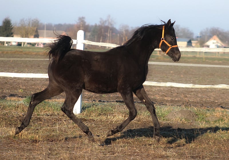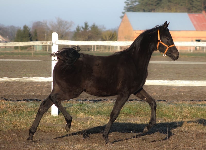 Beautiful 1 yo. COLT , black homozygous by parentage looking for a new home. He is huge and strong, Correct solid body and PHENOMENAL movements with suspension phase !!! Dakarro was born as a very big and strong foal, his final estimate height definately will be 160 cm or more !!! Interesting pedigree Sire line: Kuhailan Afas or.ar. 1930, imp. 1931 Gumniska (PL) Dam line: Hadba or.ar. 1899, imp. 1906 H. Davenport (US) In pedigree can find famous Simeon Sadik, The Desperado, Ali Jamaal , Bei Shah, Alegro, Probat ,PALAS and more... Vey Showy atittude . Perfect for breeding, show or for endurance/riding - he carries one of the best endurance bloodlines ever (Wagram****) Registered in PASB. WhatsApp + 48 513 179 245