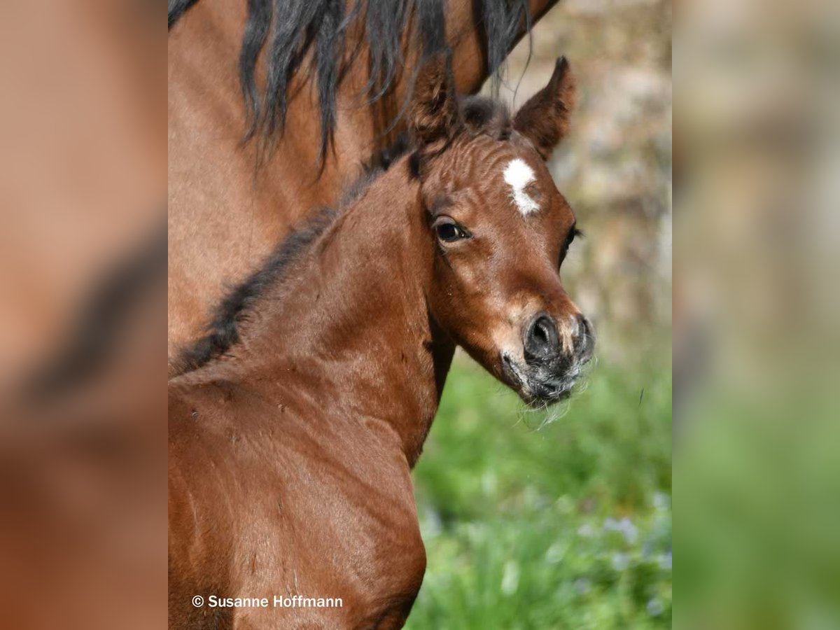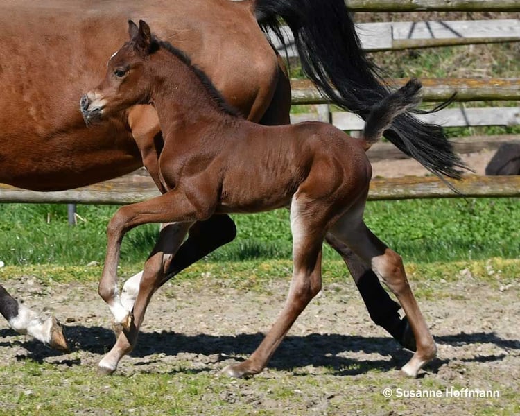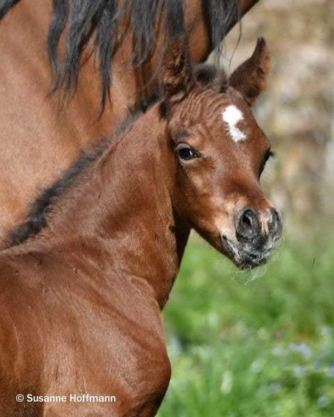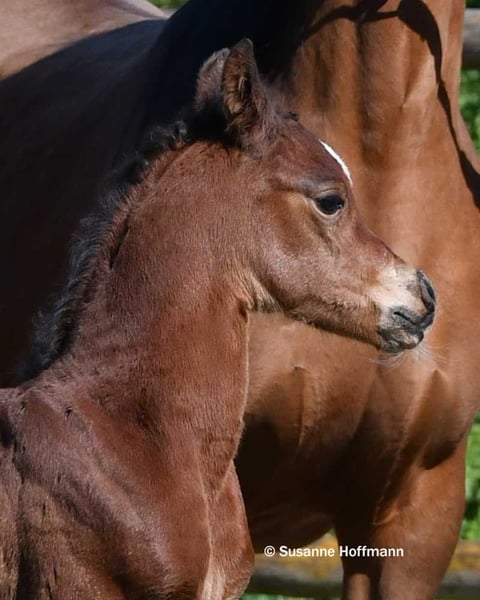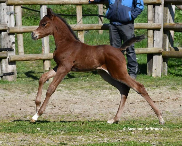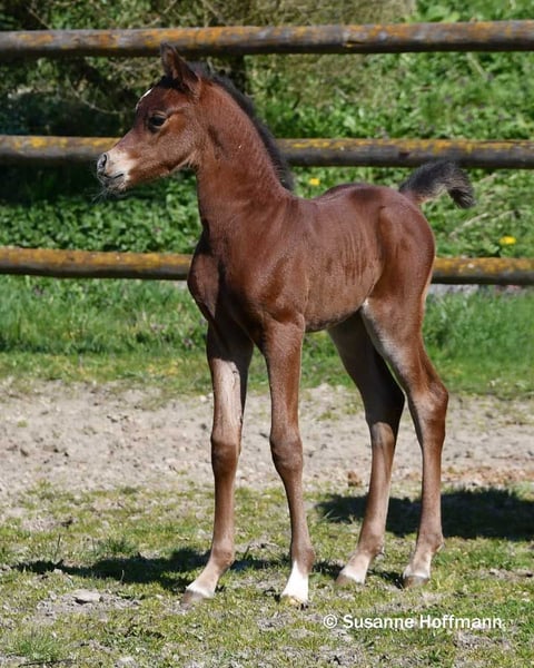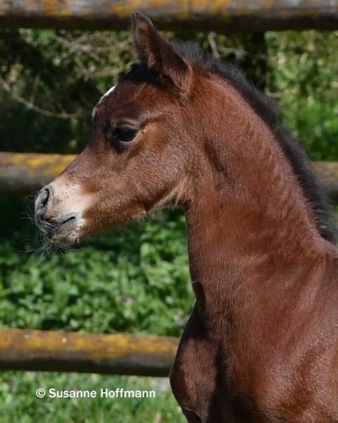 Dieses Hengstfohlen begeistert nicht nur mit viel Dish, großem Auge und einer spitzen Abstammung, sondern vor allem auch mit nahezu idealem Gebäude, Maskuliner Ausstrahlung mit einem gut angesetzten Hals, einer tollen schrägen Schulter und dabei ist er auch noch sehr muskulös. Bei ihm ist die Kombination von Arabern aus bewährten Leistungslinien und modernen Schaulinien nahezu perfekt gelungen und er zeigt schon jetzt auffallend raumgreifende, schwungvolle Bewegungen. Seine Mutter stammt direkt aus dem polnischen Staatsgestüt Janow Podlaski und ist eine Vollblutaraberstute wie ich sie liebe, mit viel Rahmen, top Reitpferdepoints, gutem Fundament, dabei Feminin und typvoll mit großem Auge und ihre hervorragenden Bewegungen können einfach nur begeistern. Sie ist auf den letzten beiden Bildern zu sehen. Vater des Fohlens ist der Hengst Exxon MA, der bereits erfolgreich auf Schauen vorgestellt wurde und einige Championatstitel gewinnen konnte. Sichern sie sich schon jetzt dieses tolle Hengstfohlen, den ich mir sehr gut als zukünftigen Deckhengst vorstellen kann.
