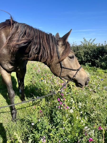 If everything fits, I am offering my 9-year-old part-bred Arabian mare in buckskin color for sale. She is a very refined horse, and I have only ridden her bitless so far. We have done a lot of groundwork and natural horsemanship. Otherwise, we mainly rode in the outdoors for leisure. I have also used her occasionally for therapeutic work. She can be very relaxed, but also as typical for Arabian horses, spirited and energetic. She also has the "turbo gait," meaning she is very fast and enjoys moving. She has always been kept in an open stall with me, and I would like this to continue for her. However, she needs a secure dry shelter, as she tends to be lower in the herd hierarchy and does not like standing in the rain. Alternatively, a paddock-box at night and pasture during the day would also be suitable for her. She is barefoot (I put hoof boots on her for rides in front) and has no problem with her hooves being handled. She has been regularly vaccinated, dewormed, and had her teeth checked annually. She also receives osteopathic treatment once or twice a year. Due to her generally high body tension, I occasionally give her small massages while grooming. Even if she can get quite lively, she is always very manageable on a long lead rope. Most recently, she was in a mare herd, but she is also familiar with mixed herds. She is not a heavy weight carrier; I would say she can comfortably carry up to 70 kg. I am only placing her in the best hands – this is not an emergency sale. She is also likely to pass on many different color genes. The last picture shows her sire, Paintabian "Shicco Ibn Shai." I have a specially fitted Deuber Jerez saddle in size S2 (Bückeburg model) for her, which can be purchased separately.