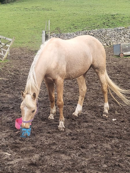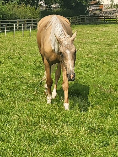 Beautiful palomino mare from the Roundhills stud. Good to catch, box and farrier. Loves to jump - jumps on her own over hedges and walls !!! Backed but needs bringing on - left to mature. 16hh 60% arab (registered with arab society) x warmblood Has potential as an eventer - has speed and power. Also would do VERY well in shows - she has fantastic movement and looks like shes floating.