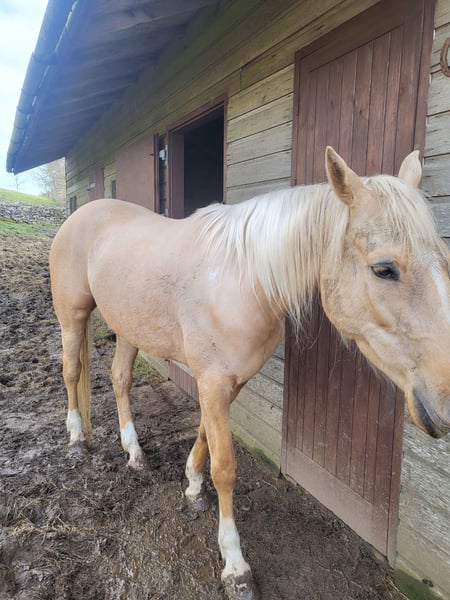 Schöne Palomino-Stute vom Roundhills Zucht. Gutmütig beim Einfangen, im Paddock und beim Hufschmied. Liebt das Springen – springt selbstständig über Hecken und Mauern!!! Geritten, aber noch entwicklungsfähig – sie braucht noch Zeit zum Reifen. Ca. 1,65 m 60 % Araber (bei der Arab Society registriert) x Warmblut Hat Potenzial für den Vielseitigkeitssport – besitzt Geschwindigkeit und Kraft. Ebenfalls wäre sie in Springprüfungen äußerst erfolgreich – sie hat eine fantastische Bewegungsqualität und wirkt, als würde sie schweben.