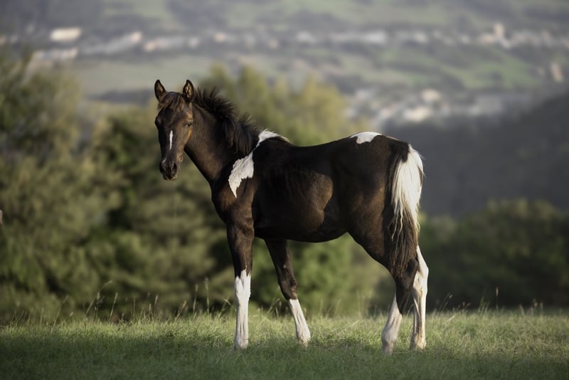Buscando un nuevo hogar 🥰 Potro pintabian tobiano negro nacido en febrero de 2025. Muy alto y correcto para su edad, con un carácter dulce. En contacto diario con personas y niños, será un buen caballo de deporte o de familia, además de tener potencial en la cría en el futuro. Madre: KA Abundantia Mira (Sauda Zahra x Adalaa EL Bey) - pintabian Padre: Elchiero (pura raza árabe, exitoso en carreras de resistencia)