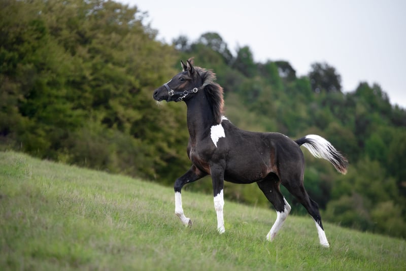 Looking for a new home 🥰 Black tobiano pintabian colt born 2/2025. Very tall and boh in his age - and with sweet character. Every day in contact with people and children, will be good sport horse or family horse, also potential in breeding in the future . Dam: KA Abundantia Mira (Sauda Zahra x Adalaa EL Bey) - pintabian Sire: Elchiero (purebred arabian succesful in Endurance races )
