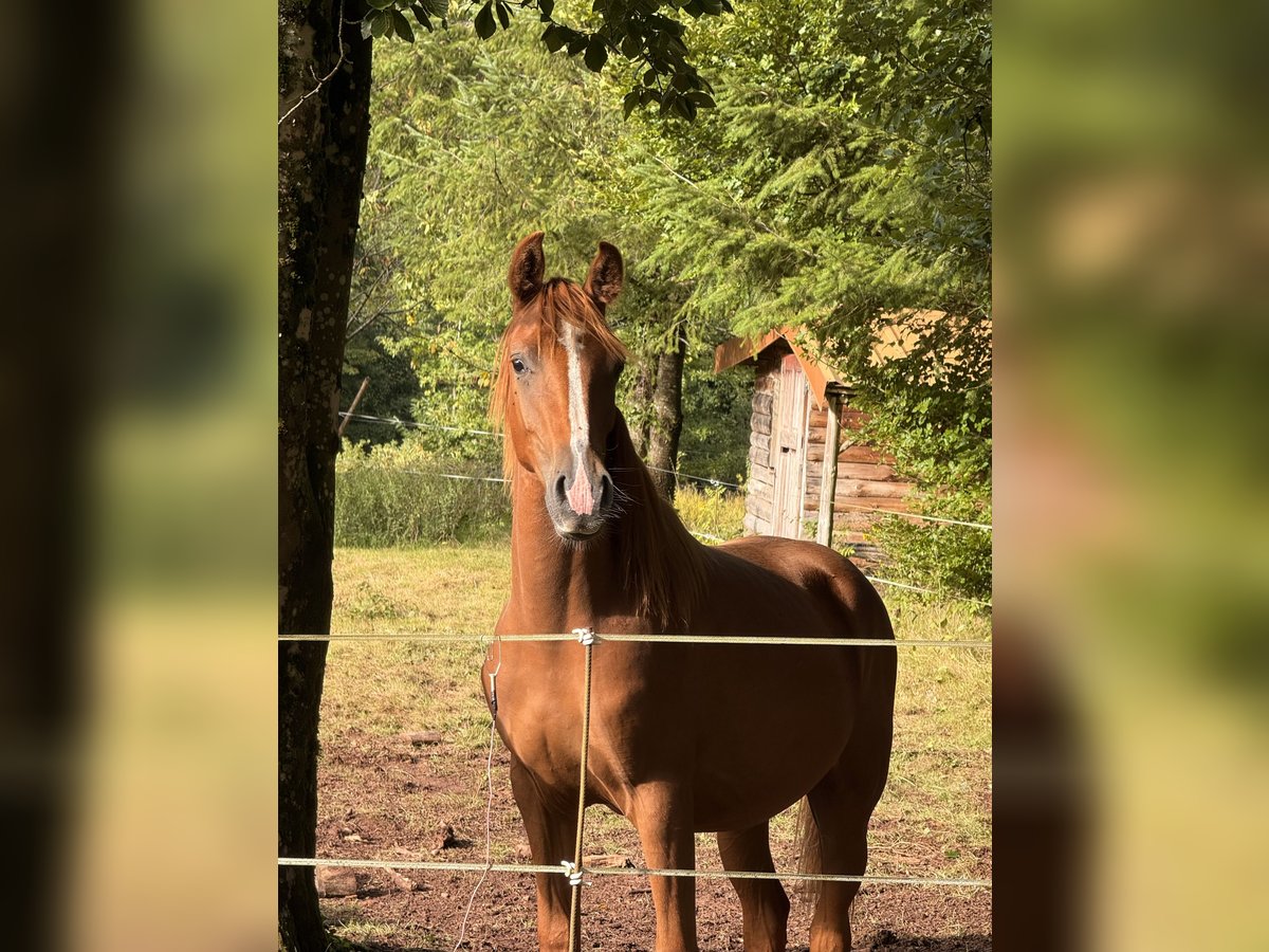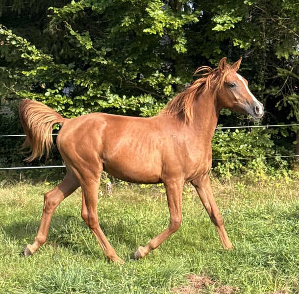 Available for reservation 🍀 The Trèfle d'Or breeding farm offers a lovely and very gentle colt (entire) born in May 2024. 🔥 Aragon Psyche TDO 🔥 75% Arabian by Nicolaï de Pawi (Padrons Psyche lineage, Padrons Immage, MYSTIC IMMAGE x NEDJNEMA, NEMAN) Let’s talk about his skills: ✅ loads into the trailer ✅ walks on a lead and in hand ✅ grooming ✅ knows how to tie ✅ he is moved from pasture to pasture on foot with other horses, so he is familiar with road traffic (trucks, motorcycles, cars, bicycles) ✅ daily handling and visits ✅ respectful of fences A bit more in-depth training will be done during the winter period. Living conditions: He has lived in a herd and outdoors with shelter since birth. He is surrounded by friends with whom he learns the ways of a horse. 🐴 Well-balanced, very cuddly and affectionate 🤗 He is a young colt who learns quickly. He has been raised with a lot of care. Physical description: 🟡 Beautiful gaits, airy and light in his movements. 🟡 Estimated adult height of 160 cm 🟡 He is bony and will be a carrier (mother is quarter/Arabian) 🟡 Entire (castration possible for an additional fee). Opportunity for breeding or just a leisure or competition horse for endurance/cross/trec 🟡 He has a very nice head type with a beautiful blaze 🟡 Burnt chestnut 🟡 Unlimited grass and hay, currently still nursing from his mother. 🟡 No health issues ‼️ He is still growing and will be promising as an adult. —> Raised with care, he is up to date on everything: vaccinations, hoof trimming, deworming, dentist seen once. IFCE papers registered ACA DSA 75% Tested SCID negative and CA carrier 💰 Payment plan available, easy payment options 🧾 Invoice and recoverable VAT for professionals Sales contract Veterinary visit at the buyer's expense Transport possible Come meet him 🥰