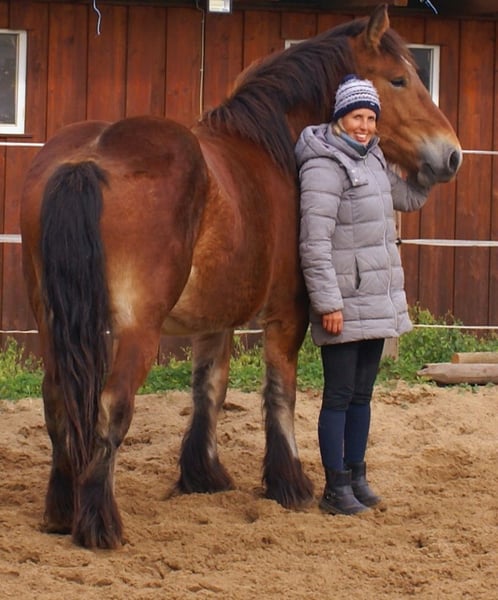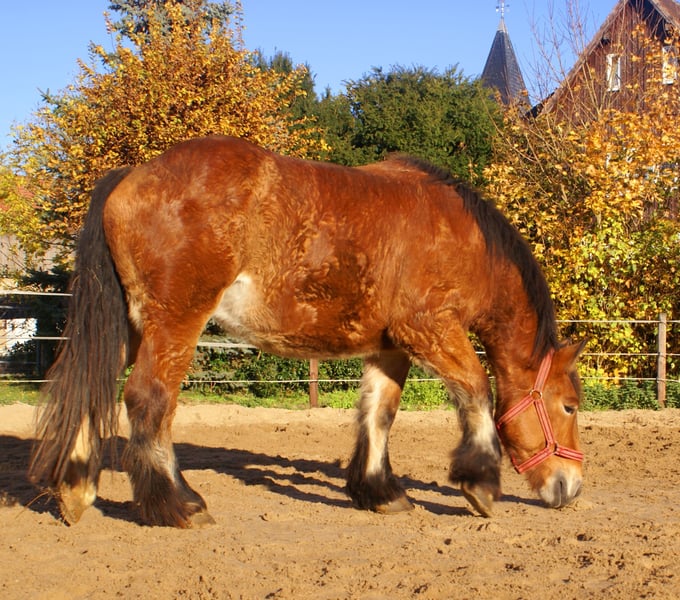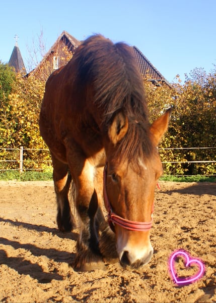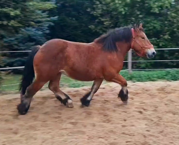 Ardennes mare with a heart of gold—friendly, laid-back, affectionate, well-built, and soon ready to start her training. Full papers. Travels well in the trailer and stands calmly alone. She is familiar with a turnout blanket, girth, dogs, and tractors. She stands nicely tied. Currently approximately 15.5 hands, quite stocky, with an expected final height of around 16.0 hands.