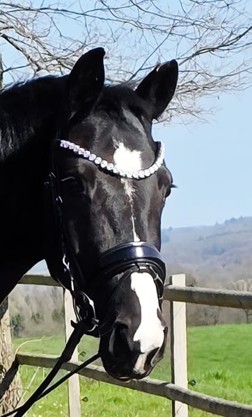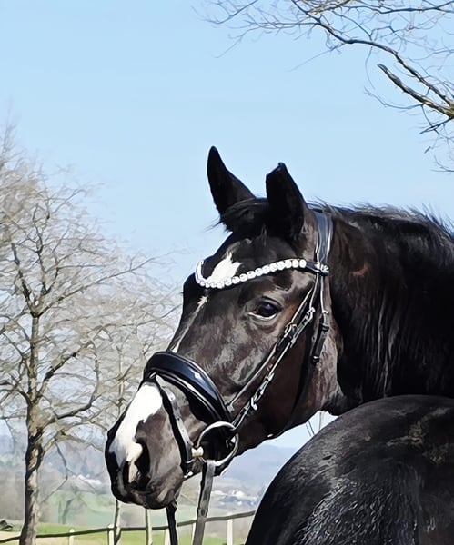 The lovely Bea comes from our own breeding program! Until the day she was started under saddle, Bea spent her entire youth outdoors, enjoying her time to the fullest. She is a stunning black mare and possesses all the qualities needed for the big arena. She impressed immediately at her first public appearance, finishing 4th in a riding horse competition. Bea handles loading, daily grooming, and washing with ease. She also enjoys plenty of cuddling and affection. She comes from a highly successful dam line. Her mother and other siblings are on the farm and can be visited. Bea has three very good gaits, has been backed, and X-ray images are available, including neck and back, all deemed normal by the veterinarian. She has a small chip, which, according to the vet, should not cause any issues but could be easily removed if desired.