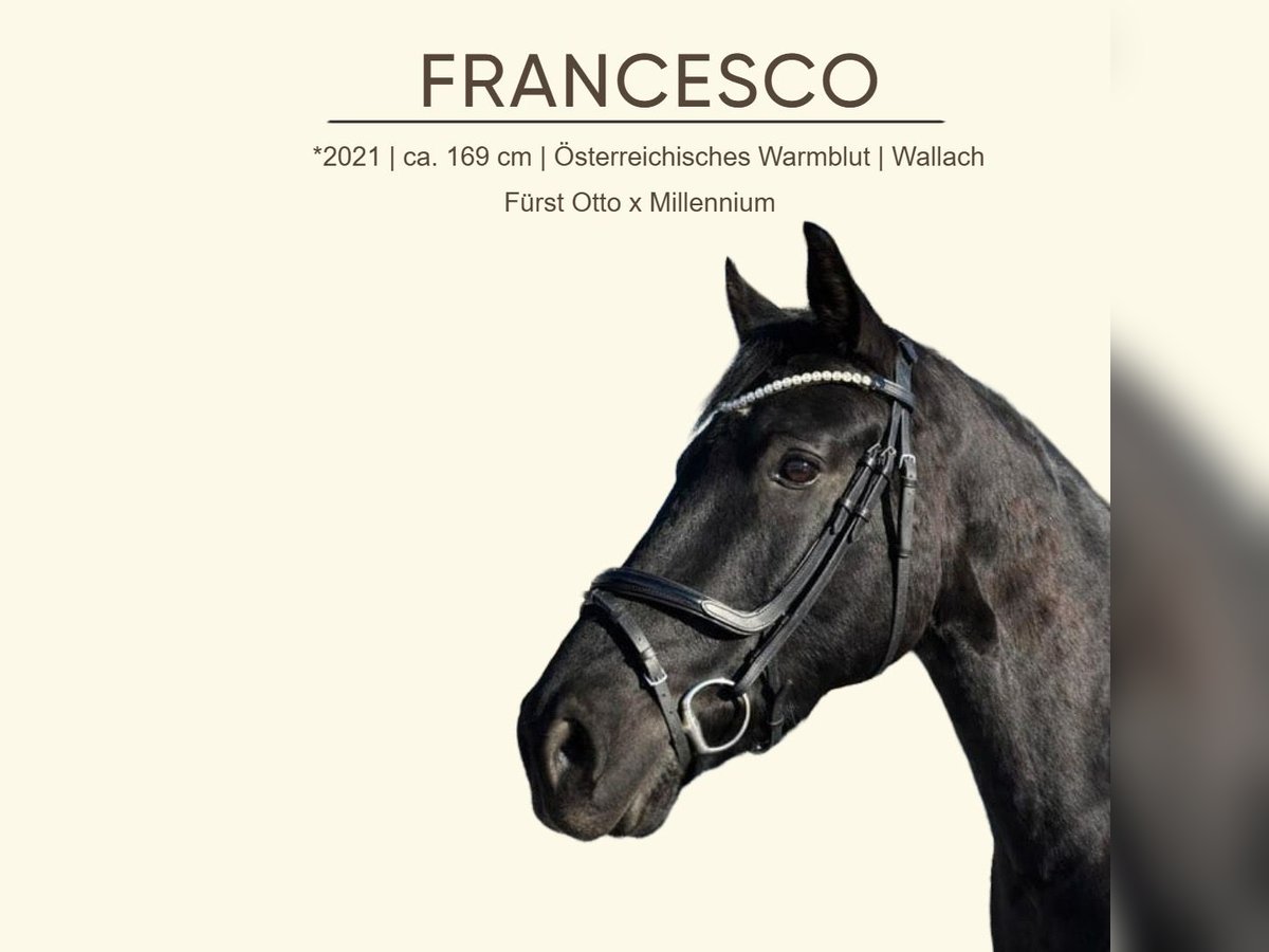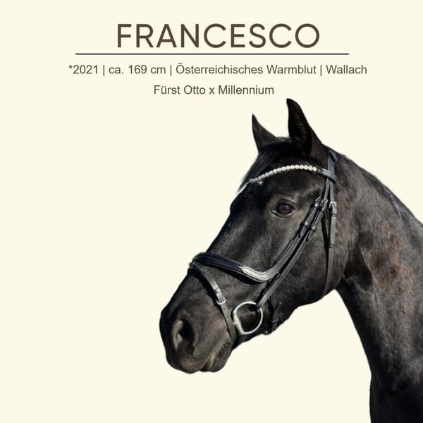 Dieser fünfjährige Nachwuchsstar überzeugt durch seine Qualität, Ausstrahlung und seine drei sehr guten Grundgangarten. FRANCESCO wurde die nötige Zeit gegeben, sodass er alters- und pferdegerecht ausgebildet ist und sich aktuell „erst“ auf Dressurpferde A-Niveau befindet. Unter dem Sattel zeigt er sich angenehm zu reiten, stets motiviert und mit dem Wunsch, seinem Reiter zu gefallen. Ist jedoch aufgrund seines Alters kein Anfängerpferd - er eignet sich hervorragend für ambitionierte Amateure auf solidem A- bis L-Niveau, die ein qualitätsvolles Nachwuchspferd mit Perspektive suchen. Im täglichen Umgang präsentiert sich der Rappe als äußerst unkompliziertes, zuverlässiges und freundliches Pferd. Ein ehrliches, schickes und talentiertes Dressurpferd mit besten Anlagen und einer vielversprechenden Zukunft.