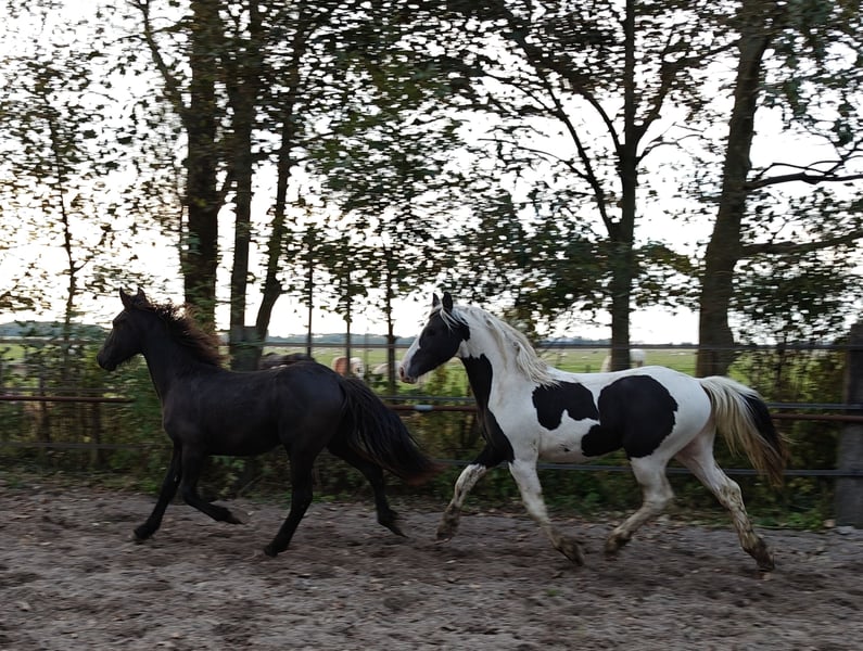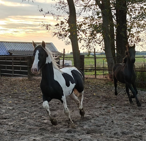 This stunning black and white Baroque Pinto stallion (a bit muddy from the pasture 😉🫣), born in 2024, is a truly charming fellow. Strong yet elegant at the same time. He was raised on our unique stud farm, @Vrijepaarden, in Tzummarum, Friesland (NL), within a herd environment. He has excellent movement and is beautifully conformed. His expected height will be approximately 1.58–1.60 meters. His sire is a Baroque Pinto with 75% Friesian blood, and his dam is a Pinto/Paint mare. At Vrijepaarden Stud Farm, we offer a wide selection of Baroque Pintos, Friesians, and Quarter Horses, all raised with love and passion. Our horses grow up as ideally as possible: free, healthy, and within a close-knit family environment. They spend the entire year in large herds with their sire, dam, aunts, and many other foals and playmates, which significantly contributes to their friendly and balanced temperament. Such qualities are rarely found elsewhere.