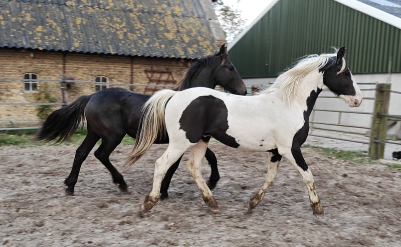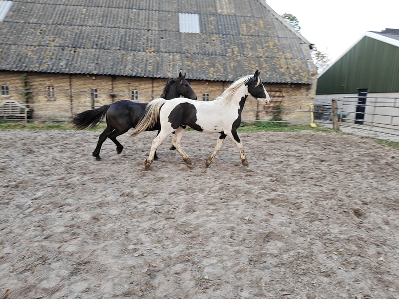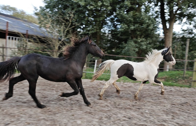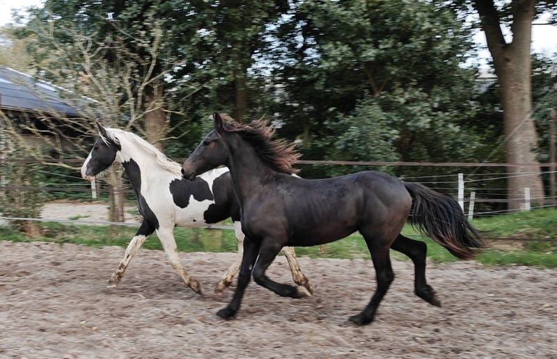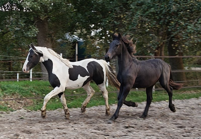 Ce magnifique étalon baroque pinto noir et blanc (un peu sale après avoir été dans le pré 😉🫣), né en 2024, est un véritable cheval de charme. À la fois puissant et élégant. Il a grandi sur notre élevage unique, @Vrijepaarden, à Tzummarum, en Frise (Pays-Bas), au sein d’un troupeau. Il possède de superbes allures et est d’une construction magnifique. Sa taille finale sera probablement d’environ 1,58 à 1,60 m. Son père est un baroque pinto avec 75 % de sang frisian, sa mère une jument pinto/paint. Sur notre élevage Vrijepaarden, nous proposons une large sélection de baroque pintos, Frisons et Quarter Horses, tous élevés avec beaucoup d’amour et de passion. Nos chevaux grandissent dans des conditions idéales : libres, en bonne santé et dans un système familial intact. Ils évoluent toute l’année en grands troupeaux avec leur père, leur mère, des « tantes » et de nombreux autres poulains et compagnons de jeu, ce qui contribue grandement à leur caractère amical et équilibré. Une telle harmonie est rare ailleurs. Chez nous, vous pouvez venir voir plusieurs chevaux directement à la ferme, à tout moment. Ils sont encore tout à fait bruts et peuvent être entraînés selon vos souhaits. Ils sont régulièrement vermifugés, pucés et titulaires d’un passeport pour équidé.