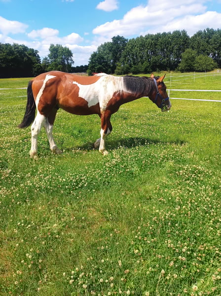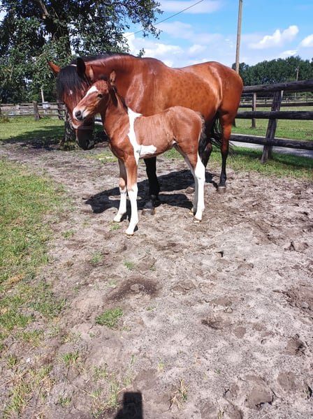 Ronny wordt in mei 2 jaar en is een lieve, attente jongen. Ik heb hem gemeten en hij is nu al 1,68 m schoft, hij wordt zeker boven de 170 cm. Moeder is Pre met papieren, vader is Barok Pinto. Beide zijn ter plaatse. Trouwens, zijn halfzus is zwart-wit en staat op de laatste foto te koop.