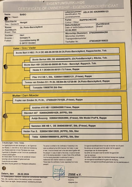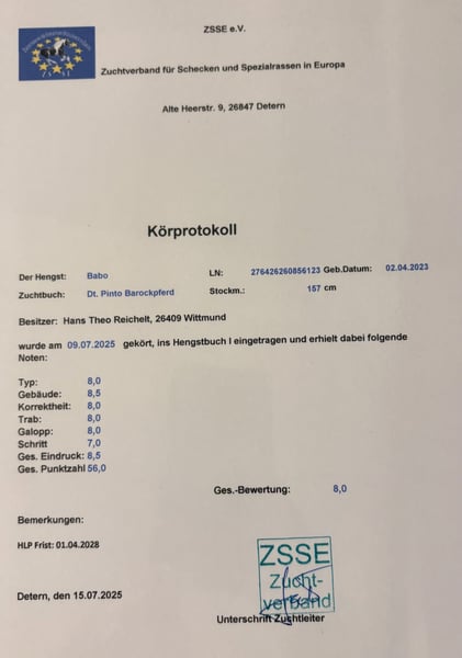Gekörter Barockpinto-Hengst Zum decken steht unser 3 jähriger gekörter Barockpinto-Hengst Babo. Seine Abstammung vereint bewährte Pinto-Linien mit hochwertiger friesischer Genetik. Über Bonte Bart ll führt sein Pedigree auf die erfolgreichen Friesenhengste Piter 312 und Andries 415 zurück. Er überzeugt durch: - barocken, typvollen Körperbau - harmonische Oberlinie - elastische Bewegung - freundliches,nervenstarkes Interieur - gesamt Eindruck 8,5 - friesenblut Anteil 93,75% Babo eignet sich ideal zur Veredlung von Barock-Freizeit-und Dressurpferden mit Fokus auf Typ,Charakter und Farbe.