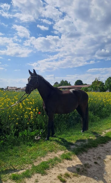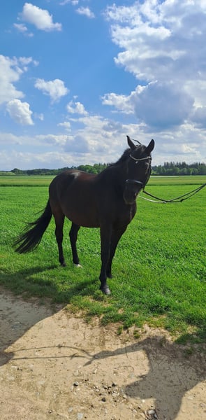 Rasse: Bayerisches Warmblut Alter: 9 Jahre Geschlecht: Wallach Stockmaß: 165 cm Farbe: Schwarzbraun Abstammung: Bossanova Haltungskonform: Aktivstall/Offenstall in der Wallachherde Verwendungszweck: Freizeit, Dressur, Working Equitation Er ist regelmäßig Entwurmt, geimpft und im März 2026 wurden die Zähne gemacht. Er besticht durch seinen äußerst feinen Charakter. Er ist verschmust, aufgeweckt und sehr intelligent. Er liebt die Haltung im Aktivstall und soll auch in Zukunft diese Art der Haltung genießen dürfen. Er ist zuverlässig und geht problemlos alleine ins Gelände – egal ob zum Spazieren oder Reiten. Er ist ein toller Reitpartner für alle, die Spaß an der Arbeit mit einem freundlichen und zuverlässigen Pferd haben. Er wird in der Halle, auf dem Platz oder im Gelände gearbeitet. Er hat regelmäßig Beritt. Er kommt super mit vielen Pferden auf Halle und Platz aus. Wir stehen auf einem Stall mit Schulbetrieb mit vielen Ponys. Der Vollständigkeit halber: Barni hat zwei kleine, seit Jahren unveränderte Sarkoide, die bisher keinerlei Probleme gemacht haben. Laut Tierarzt besteht aktuell kein Handlungsbedarf. Wichtig: Für ein Probereiten erbitte ich 50 €, die beim Kauf selbstverständlich zurückerstattet werden. Bitte nur ernst gemeinte Anfragen – keine Schulbetriebe. Bei Interesse oder Fragen stehe ich gern zur Verfügung. Ich freue mich auf eure Nachrichten!