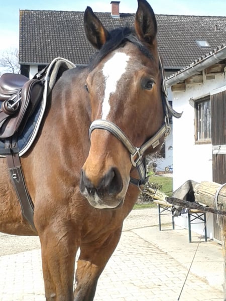 Da León nicht mehr soviel Freude am Springen zeigt, suche ich für meinen Wallach ein neuen Besitzer der Spass am ausreiten, Cavaletti- und Stangenarbeit und Bodenarbeit hat und sich an einem Pferd erfreut, dass, wenn es Jemanden kennt, absolut bezogen ist, auf Zuruf von der Koppel kommt und die Gesellschaft von seinem Zweibeinigen Mörchengeber genauso genießt, wie die von anderen Pferden. Er ist einfach viel zu fit um schon in Rente zu gehen. León ist absolut gut erzogen - Pferdeerfahrung und Routine im Umgang wären dennoch wichtig, da er ein paar kleine Macken hat, die aber kein Problem darstellen, wenn man gelassen damit umgeht. Hier ein paar Eckdaten zu León: - León ist bis M Springen ausgebildet - Hat eine solide Grundausbildung - Kann alleine wie auch in Gruppen geritten werden (Platz, Halle, Gelände) - ist Geländesicher (geht über Baumstämme, kennt Wasserdurchritte, etc.) - Ist absolut verladefromm - kennt Hunde, Schafe, Hühner, Alpakas - Er ist absolut Kinderlieb (steht momentan in einer Schulpferdeherde) - Kennt Boxenhaltung mit viel Koppelgang und Offenstall - ist sehr sozial mit anderen Pferden und lässt sich gut intigrieren (auch in gemischten Herden) - Geht Barhuf oder beschlagen - Er hat bei mir die letzten 12 Jahre weder gelahmt, noch gekolikt, kein Kotwasser, Exemer, etc. Ich bin leider kein Freizeitreiter, reite sehr viele Pferde am Tag und werde im einfach nicht mehr gerecht. Er hat im letzten Jahr eine Grippe verschleppt und Probleme mit der Atmung bekommen, was wir aber wieder gut in den Griff bekommen haben. Momentan ist er wieder klinisch absolut unauffällig. Dennoch sollte möglichst auf gute Heuqualität und strohfreie Einstreu geachtet werden. Alles an Zubehör von Sattel, Trense, Decken, Gebisse, Gamaschen kann mit erworben werden. Hier gilt ganz klar Platz vor Preis! - ich suche wirklich Jemanden der Freude an León hat und muß kein Geld mit ihm verdienen! Alles weiter gerne per Mail, Whatsapp oder telefonisch. 0178/60 50 557