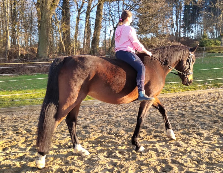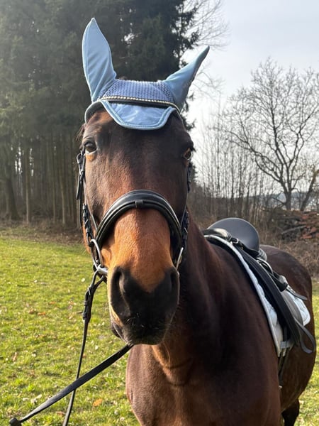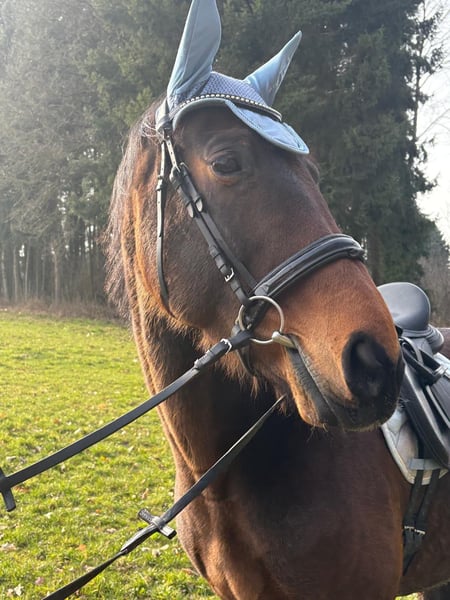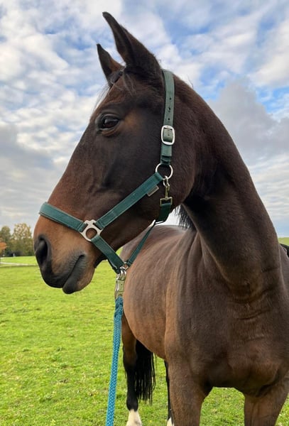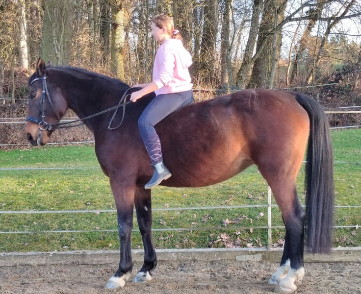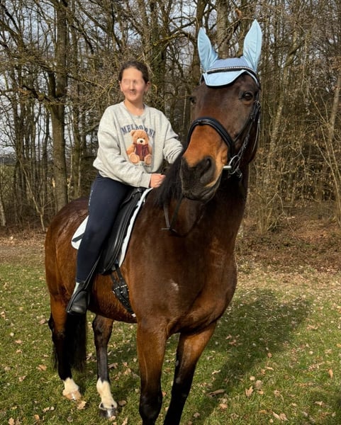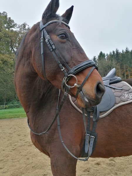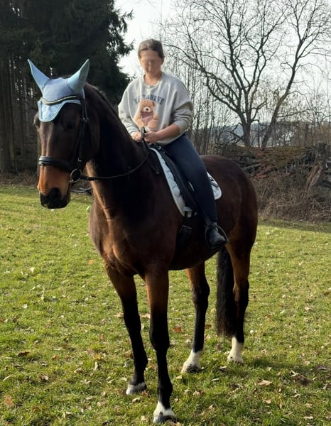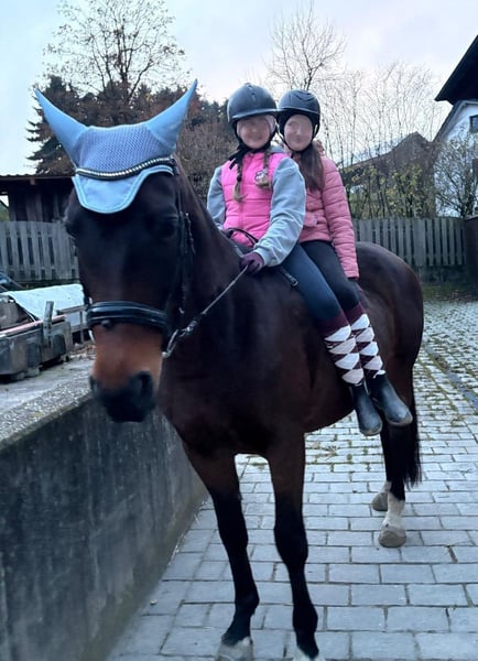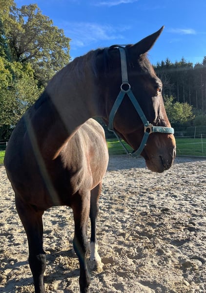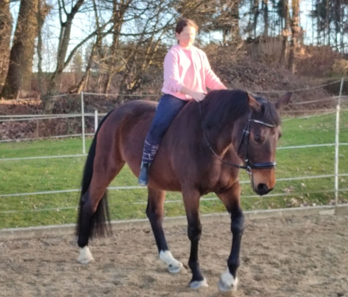 Wir geben aus Altersgründen die Pferdehaltung auf und ich werde mich von meiner bald 13jährigen Stute Taqueena trennen. Sie ist mit ihren 1,72 m Stockmaß ein sehr stattliches Pferd. Seit drei Jahren steht sie bei uns Zuhause auf dem Hof mit einem Wallach in Boxenhaltung mit täglichem Weide-/Paddockgang. Vorher war sie im Offenstall mit ca. 30 Pferden. Sie ist also beide Haltungsformen gewöhnt (fühlt sich aber vermutlich wohler, je mehr Pferde sie um sich hat). Die Vorbesitzerin hat sie als Fohlen gekauft und ausgebildet. Auf Facebook und Instagramm oder einfach mit Google sind unter Taqueena Royal noch Beiträge aus dieser Zeit zu finden. Das Rottaler Warmblut vom Zuchthof Wimmer hat eine gute Abstammung und ist kerngesund. Wir haben in den drei Jahren nie einen Tierarzt gebraucht, außer für Impfungen. Auch der Zahnarzt war im Frühjahr noch einmal zur Kontrolle da: kein Befund. Sie war schon immer Barhufer. Bei Tierarzt, Zahnarzt und Schmied ist sie brav. Taqueena ist sehr verschmust und menschenbezogen, braucht aber viel Routine und einen ruhigen und konsequenten Umgang. Sie ist lernwillig und eifrig bei der Bodenarbeit und bei der Dressur. Wir haben kleine Kinder auf ihr longiert. Zwei Anfängerinnen nehmen jede Woche Reitunterricht auf Taqueena und sind völlig vernarrt in sie. Sie ist feinrittig und in allen Gangarten sehr angenehm zu sitzen, auch ohne Sattel. Trotzdem ist sie kein richtiges Anfängerpferd, da sie ihren Reiter auch gelegentlich austestet. Ins Gelände geht sie nicht allein. Auch mit Begleitung ist sie vor allem in Siedlungen oft nervös und angespannt. Im Wald und freien Gelände ist sie eher ruhig und gut händelbar, im Straßenverkehr gab es nie Probleme. Sie braucht einen souveränen Reiter, der ihr viel Sicherheit vermittelt. Bitte nur bei ernsthaftem Interesse melden. Weitere aktuelle Videos können gerne geschickt werden. Bei ernsthaftem Interesse ist Probereiten auf dem Reitplatz möglich. Es handelt sich nicht um einen Notverkauf. Taqueena darf noch so lange bei uns bleiben, bis sich ein neuer Platz gefunden hat. Im Preis sind alle Sachen enthalten, die ich für sie habe wie Decken, Putzzeug, Pflegemittel usw. Dressursattel und Trense (wurde von der Vorbesitzerin neu für sie angeschafft und angepasst) können gegen Aufpreis erworben werden.