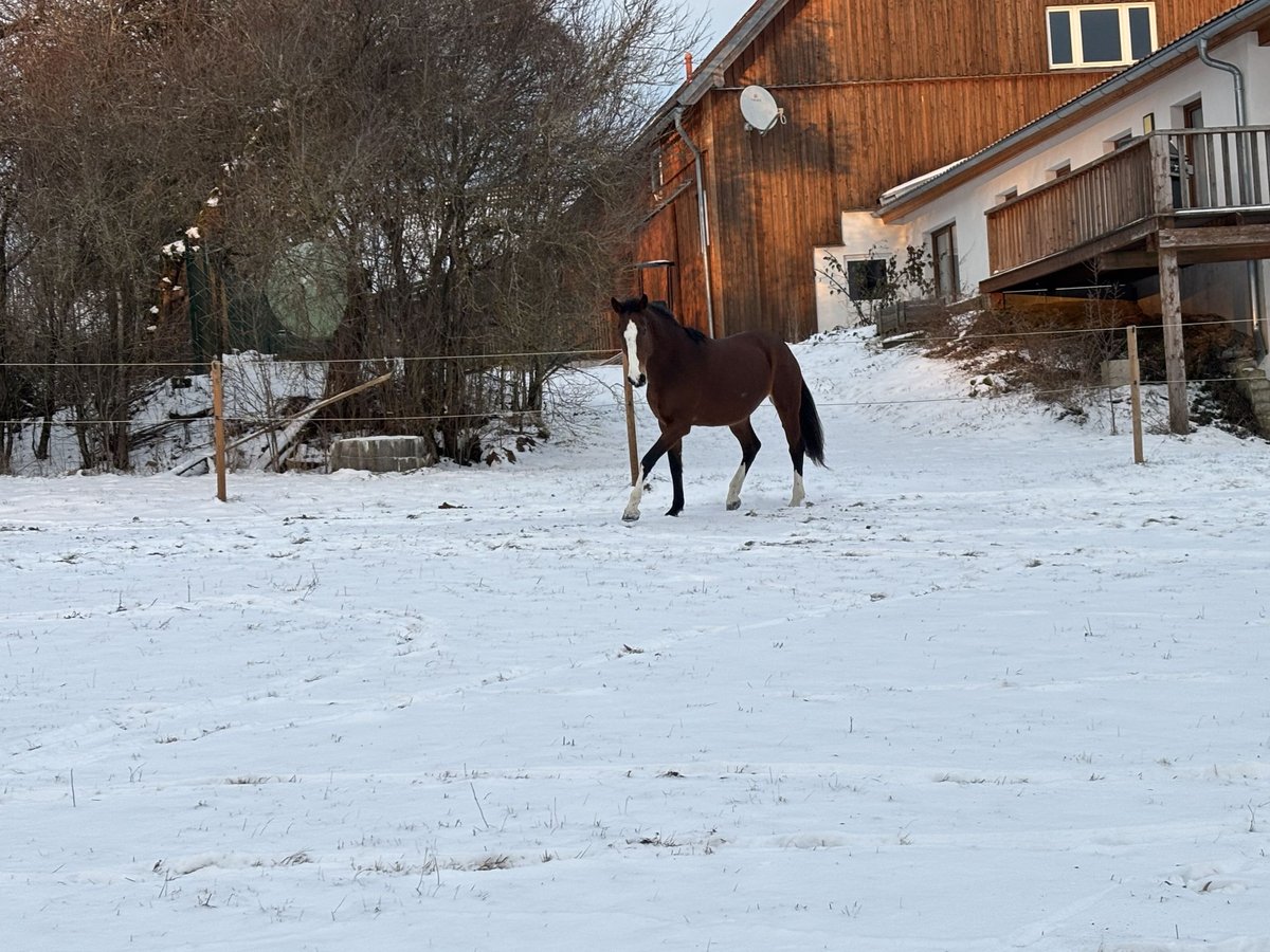 Leider muss ich aus persönlichen Gründen meine sehr menschenbezogene und sensible bayerische Warmblutstute abgeben und suche somit einen schönen Platz, mit täglichem Auslauf und Koppelgang. Lascaraa kommt ursprünglich aus dem Springsport, ihre Abstammung ist auch springbetont. Seit Lascaraa in meinem Besitz ist sind wir viel alleine im Gelände geritten, hierbei zeigt sie sich auch mal energisch und temperamentvoll, für einen stärkeren Reiter aber händelbar. Mit anderen Pferden ist sie gelassener, jedoch kein Anfängerpferd. Dressurmässig kennt sie Lektionen der Klasse L-M. Bei mir steht Lascaraa im Offenstall, kennt aber auch Box und ist herdenverträglich. Erstkontakt ausschließlich per WhatsApp