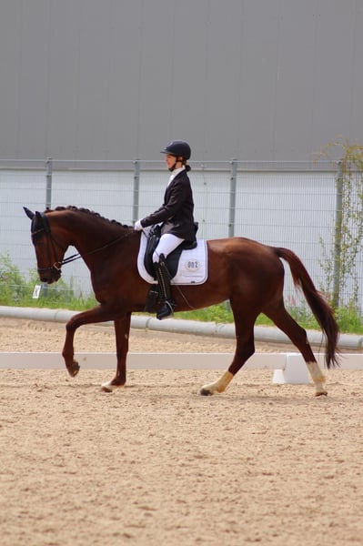 For sale is this lovely dark chestnut mare, who enabled our nine-year-old daughter to successfully transition to full-sized horses and significantly contributed to her success in E- and A-level dressage, as well as her inclusion in the perspective squad. Initially, the mare was ridden very straightforwardly with side reins and lunged, patiently supporting our daughter's development as a rider. Now, at 12 years old, both have progressed to confident L-level dressage tests and some M-level exercises. Thanks to her great enthusiasm for jumping, the pair has also gained valuable experience in show jumping courses. The mare is familiar with pole work, free jumping, lunging, overnight stays away from home, riding with a halter, and much more. Due to local conditions, we rarely went on trail rides ourselves, but her previous owner regularly included them in her routine. As she is a full family member, we are only offering her to loving and responsible owners. We hope she can once again help a child or young rider develop and flourish, or be supported by an ambitious recreational rider with the same care and respect. No pasture kept in a herd.