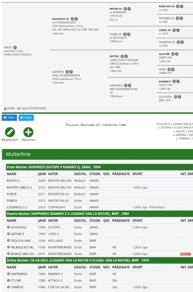 Vendo la mia femmina nata nel 2009, alta circa 1,73 m e piazzata fino a S**. È figlia di Camparino (pedigree sotto le foto) e ha un fratello stallone approvato, piazzato fino alla classe S in dressage. La sua ultima gara è stata all’inizio del 2023, dopodiché l’abbiamo acquistata e utilizzata come cavalla da riproduzione. Attualmente non viene montata e non è in gravidanza. Potrei considerarla nuovamente come cavallo da dressage o come cavalla da riproduzione.