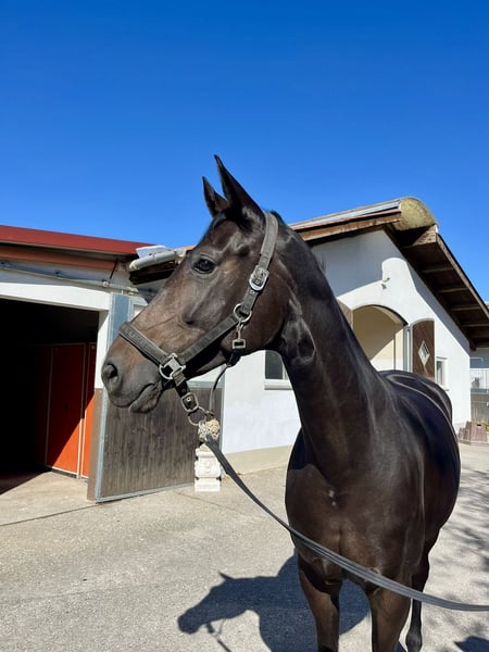 Beautiful dark brown five-year-old mare for sale. Fürstin Filippa moves with great energy and has a lovely gallop. She was bred by us and is currently in training with Thomas Hahn. Unfortunately, she has a strong fear of other horses, which is why we are offering her below her value to an ambitious leisure rider. She is very pleasant to ride, well-behaved, but not suitable for beginners. She is very people-oriented and affectionate. She has been in training for three and a half months now and is making great progress. Home before price.