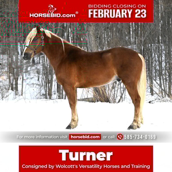 💎 𝐓𝐇𝐄 𝓓𝓲𝓪𝓶𝓸𝓷𝓭 𝐒𝐇𝐎𝐖𝐂𝐀𝐒𝐄 💎 Happening now thru MONDAY | FEBRUARY 23rd - Available EXCLUSIVELY on HorseBid's website! For more details and to register visit: www.Horsebid.com CONSIGNOR CONTACT: Wolcott's Versatility Horses and Training 585-734-0169 LOCATION: Warsaw, NY BREED: Belgian/ QH cross REGISTERED: No REGISTERED NAME: Turner COLOR: Sorrel HEIGHT: 15.1 AGE: 6 GENDER: Gelding Turner is a 6-year-old Belgian/QH cross gelding standing 15.1 hands, and he’s the kind that’s hard not to like. Turner has miles of trail rides under his belt. He’ll ride at the front, hang at the back, or settle in the middle, wherever you put him, he’s happy. Water, logs, steep hills up or down, he just goes about his business without any fuss. He’s been there and done that, and it shows. He’s a versatile guy, too. You can clean him up and take him in the English ring, or throw on your trail saddle and head out for a relaxing ride. He’s always the same steady horse, no matter the plan for the day. Turner stands patiently while mounting and dismounting. He has 3 comfortable gaits and smooth transitions. Quiet, easygoing, level-headed, and reliable sum him up. His walk, trot, and lope are smooth and steady; just an easy, enjoyable ride every time. He also side passes, backs up, and knows how to use his body. He has jumped a course, then turned around and was used in a session teaching veterans how to interact with and ride horses. He has done countless lessons with special needs students. Turner is always 100% into work. He acts like an old soul. He’s been around all types of livestock, and it does not faze him. Traffic and heavy equipment don’t bother him. Turner has a kind and expressive eye and loves to please! No health issues, no special feed requirements. He stalls quietly, gets along well with both mares and geldings, and is easy to have around the barn. Clipping, bathing, vet work; he stands like a gentleman. Turner loads right up in the trailer, hauls quietly, and unloads just as politely as he went in. He’s 100% sound, no vices, and ready to go on with his next person. PPEs are welcome at the buyer’s expense. Contact Dayton at 585-734-0169 to talk about Turner. He is located in Warsaw, NY.