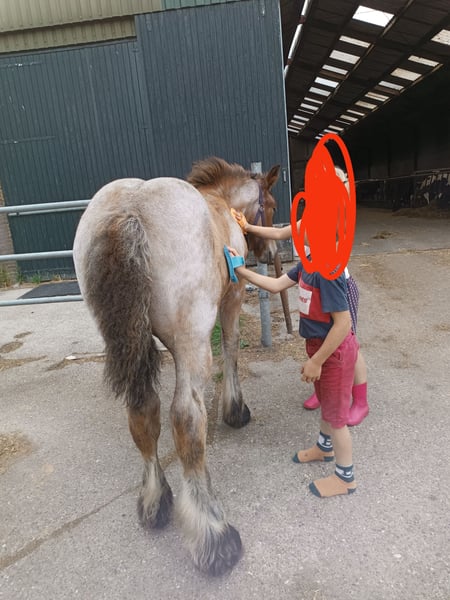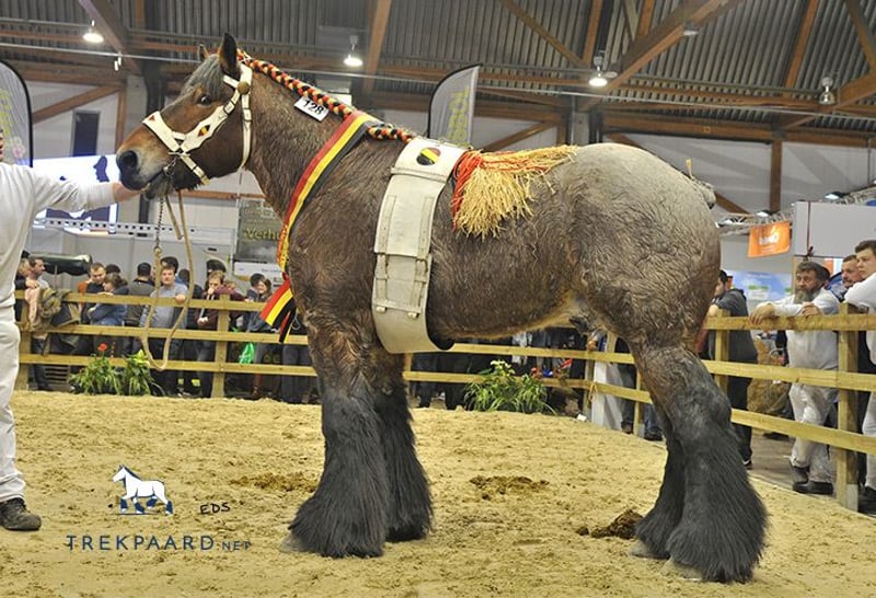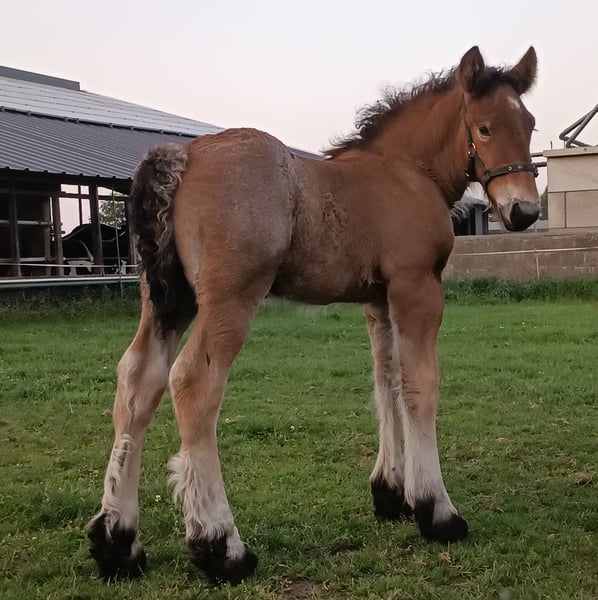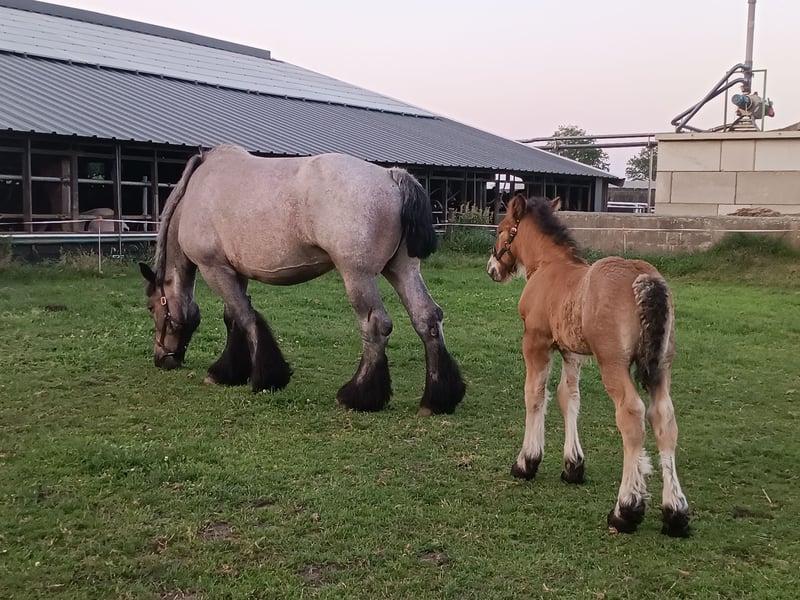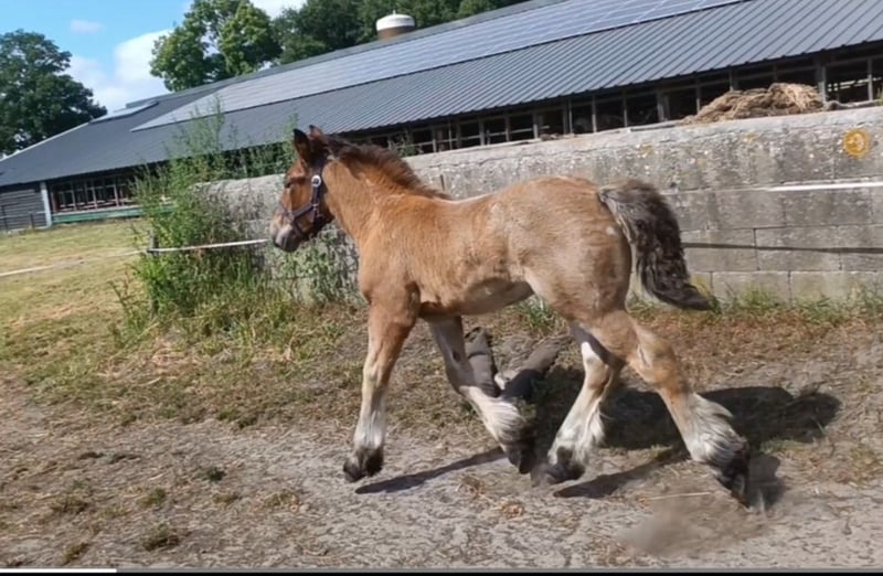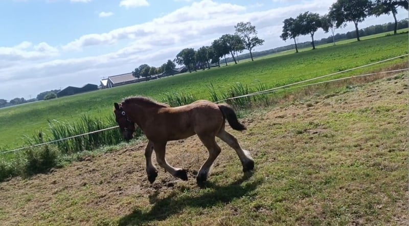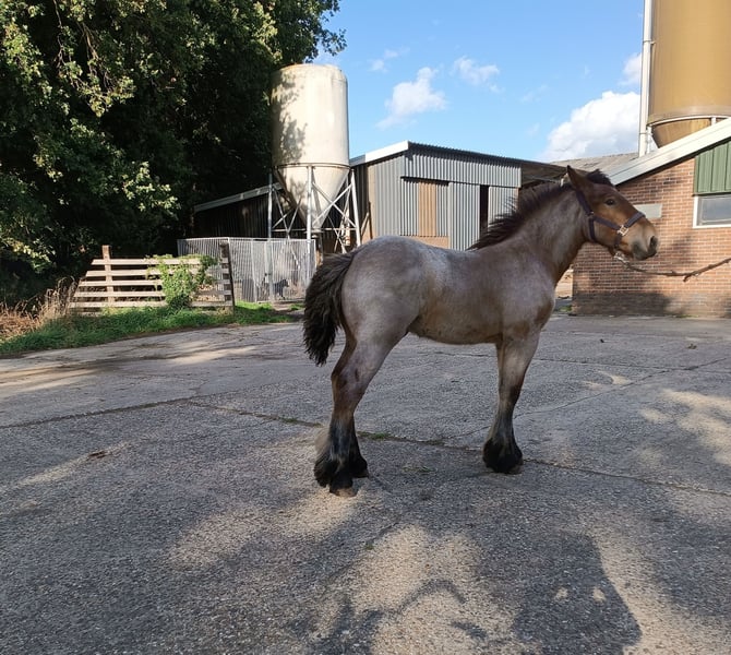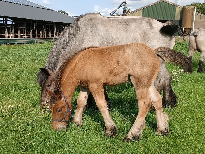 Offered due to a reduction in the number of horses. Brownish-gray Belgian Draft Horse colt Vino van Luchteren x Jana van het Thiendehof. Interesting bloodlines. The sire, Vino van Luchteren (see last photo), has been multiple times champion in Belgium. The dam is ridden under saddle and is a luxurious mare with strong, sound legs (!). The granddam is Tooske van de Dekkershoef, a full sister to the Dutch champion HK 2016 Siem van de Dekkershoef. Vino's bloodline is known for its exceptionally honest, gentle, and calm temperament; children can walk with him (on unfamiliar terrain). He has not put a foot wrong yet. He is familiar with basic handling: leading, water, trailer, etc. Good, correct (floating) gaits. Beautiful posture, like his sire. Expected to mature into a large size (dam >1.74 m, sire 1.75 m). Dealers or bargain hunters are kindly asked not to respond. We observe a rest day on Sundays.