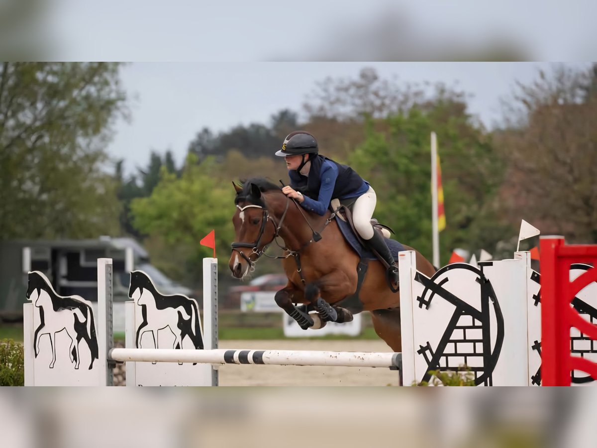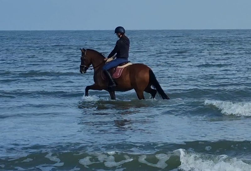 Aufgrund des Wechsels zu den Pferden steht dieser kompakte D-Pony zum Verkauf: Road Runner – 147 cm – Wallach (Machno Carwyn x Santano Van Germania). Er verfügt über umfangreiche Wettkampferfahrung im Springen bis 110 cm und in der Dressur auf DL2-Niveau. Er hat drei schöne Gänge, ist nicht heiß im Temperament und besitzt ein äußerst ruhiges Wesen. Sehr brav im Umgang, beim Schmied, beim Putzen, beim Aufsatteln, auf dem Anhänger usw. Er ist es gewohnt, durch Wasser zu laufen, Strandritte zu machen, ohne Sattel zu reiten und ist für Ausritte im Gelände allein oder in der Gruppe geeignet.