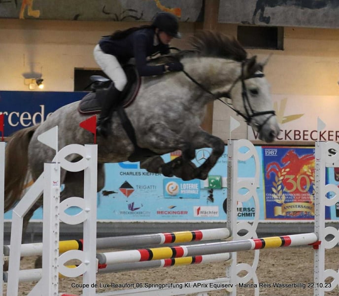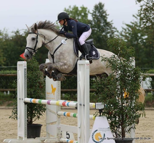Cavallo gentile e grande, non lasciatevi spaventare dalla sua altezza, questo cavallo di 1,80 m è una palla d'amore molto vicino all'uomo e rispettoso. Non ha mai fatto cadere nessun cavaliere. Si può "dimenticare" per una settimana al pascolo e venire a montarlo, non farà nessun passo falso. Attualmente montato da un'amatrice, è un maestro di scuola e farà sicuramente la felicità di un adolescente. Conosce le basi del dressage: è rotondo nelle tre andature e cambia piede al galoppo. Va in passeggiata senza alcun problema. Cavallo con buone capacità nel salto ostacoli (ha saltato fino a 1,15 m in Germania) ma è riluttante, per questo motivo preferiamo trovargli una famiglia che si dedichi piuttosto al "tempo libero migliorato" e chissà, un giorno, con la persona giusta, potrebbe fare belle performance in concorso. Cavallo che purtroppo è cresciuto troppo in fretta, il che gli vale delle radiografie un po' medie (piccolo navicolare) che sono gestite senza problemi grazie a un'adeguata ferratura e, se necessario, a una terapia con leech. Venduto direttamente dall'allevatore, solo per buona casa.