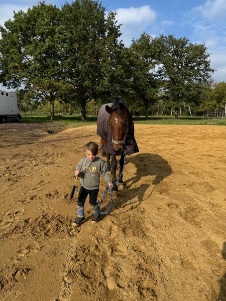 Mooie 8 jarige ruin. Super lief en aanhankelijk paard. Eerlijk karakter en gemakkelijk te rijden. En lammetje tijdens het dressuurwerk, op parcours eerder goed vooruit. Doet altijd zijn best om een foutloos rondje neer te zetten. Braaf tijdens buitenritten zowel alleen als in groep. Niet geschikt voor beginners, kan prima dienen voor overgang pony naar paard als de ruiter gewend is een voorwaartse pony te rijden. Een meewerkend paard om fijn mee te groeien. Hij heeft wedstrijd ervaring tot 1m20 waar hij verschillende keren foutloos en geklasseerd was. Hij gaat gemakkelijk de vrachtwagen op, is braaf bij de hoefsmid en bij de tandarts (jaarlijks). Schofthoogte 1.67m RX goedgekeurd in september 2021