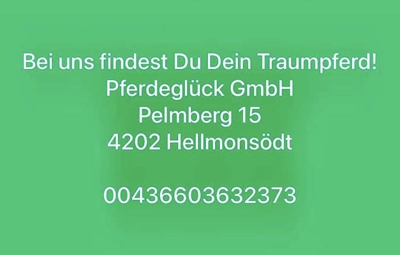 Du bist auf der Suche nach einem passenden Pferd? Oder möchtest Du Dein Pferd verkaufen? Dann bist Du bei uns, bei Pferdeglück in Pelmberg ganz RICHTIG! Wir sind Dein verlässlicher Partner für den Pferde An-, und Verkauf. Ob Pony, sportliches Warmblut oder gemütliches Kaltblut, - wir haben immer eine große Auswahl an tollen Pferden für Dich. Deine Vorteile bei uns: * garantierte telefonische Erreichbarkeit an 7 Tagen die Woche unter 0 6 6 0 3 6 3 2 3 7 3 * Kostenloses Probereiten täglich Mo - So von 8 bis 20 Uhr * gerne werden die Pferde auch vorgeritten * Wetterunabhängigkeit durch 2 Reithallen * Auf Wunsch Organisation einer Ankaufsuntersuchung * Transport Deines neuen Pferdes in den Stall Vereinbare noch heute einen persönlichen Termin zum Probereiten oder lass Dich ganz unverbindlich beraten! Wir freuen uns auf Deinen Besuch!