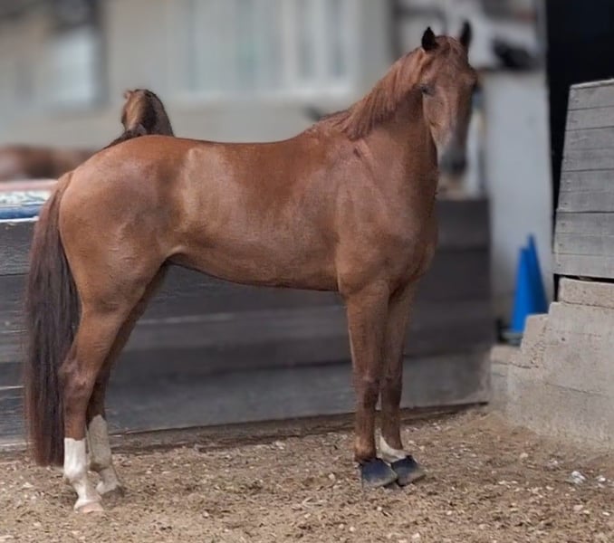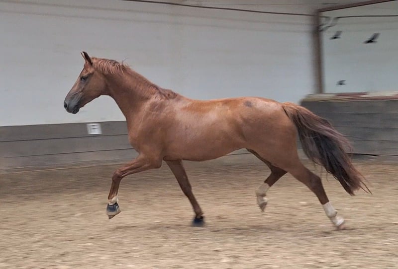 Expressive, beautiful dark chestnut mare ☆☆☆ Flumie ☆☆☆ Three very good basic gaits Winner in Riding Horse and Dressage Horse Class A Ridable with go Generally well-behaved and sensitive Healthy, with good X-ray results available Incredibly sweet and human-oriented horse Flumie enjoys groundwork and liberty work very much Very friendly with other horses, tends to be lower in the herd hierarchy Not for sale to resellers I look forward to friendly inquiries Video available upon request Test ride €35